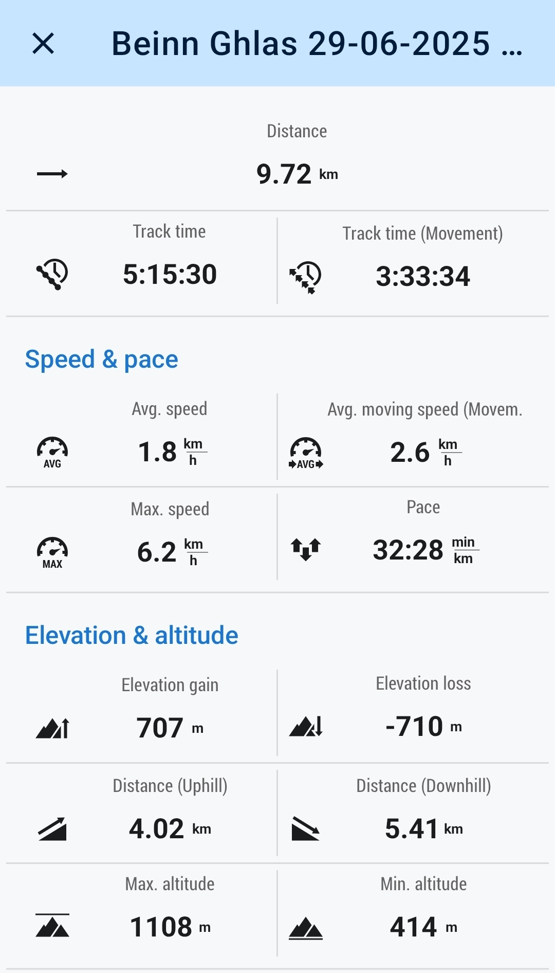 The tracking data is that which my tracking device, and there have been a few over the years, so these may be different on earlier walks, currently I am using Locus Maps tracking app, and provides data such as time, distance, ascent etc.