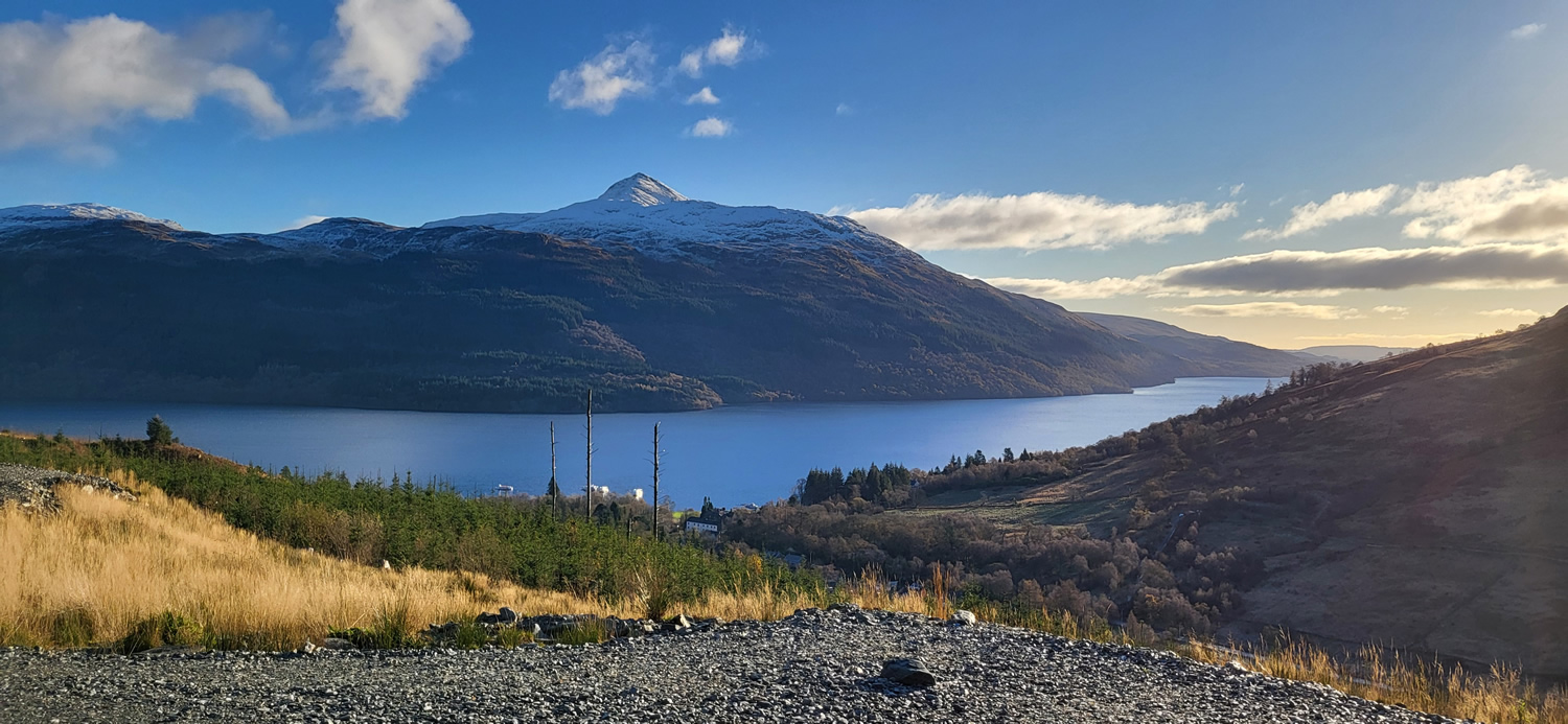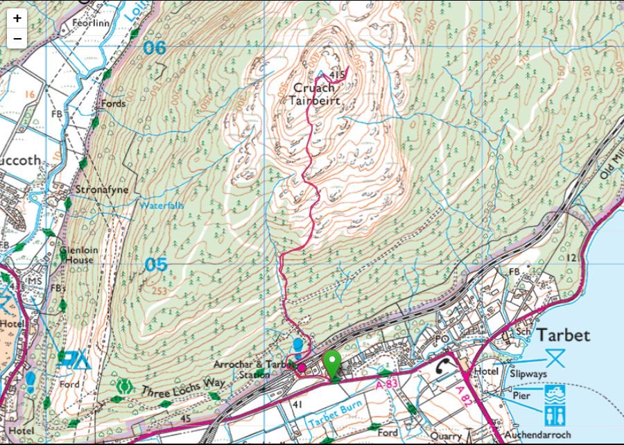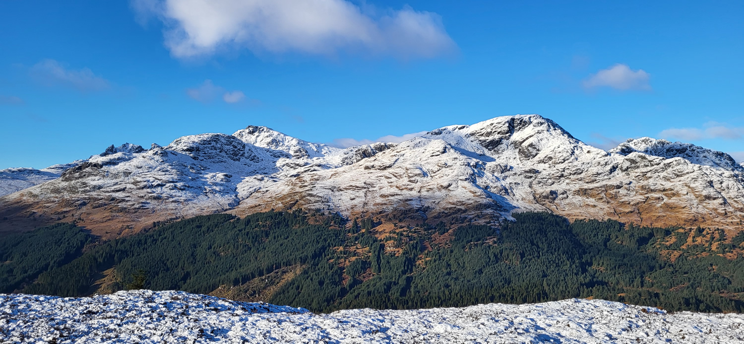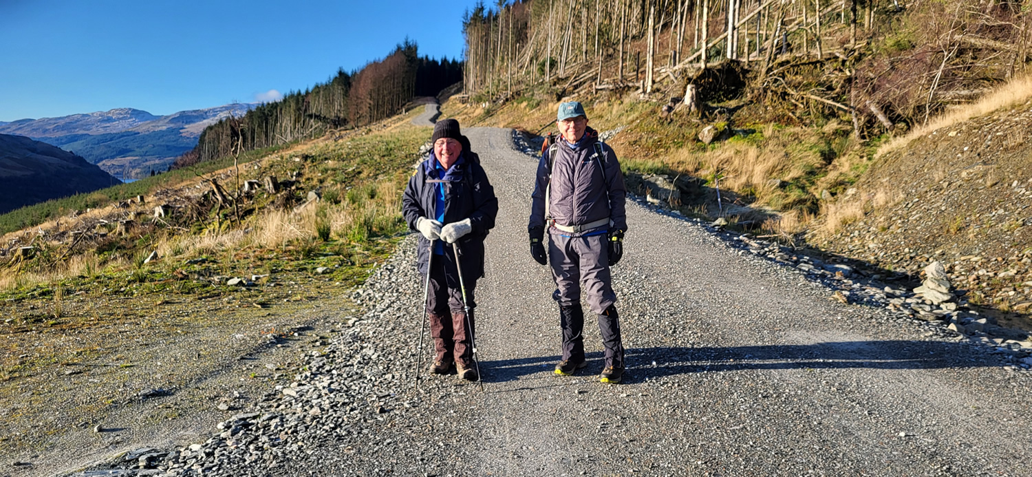 The plan for today was a recce for Mike’s upcoming Tullich Hill walk, but doubts as to driving up and along the Glen Douglas road given the overnight temperatures meant a plan B instead, a look to see how the forestry work on Cruach Tairbeirt was progressing. Leaving the Slanj car-park our change of plan was somewhat prudent as one side of the short section of road up to the station was covered in heavy ice where some lying water had obviously frozen solid, and Glen Douglas can be a bit of a wet road with water running off of the hillside at the best of times.