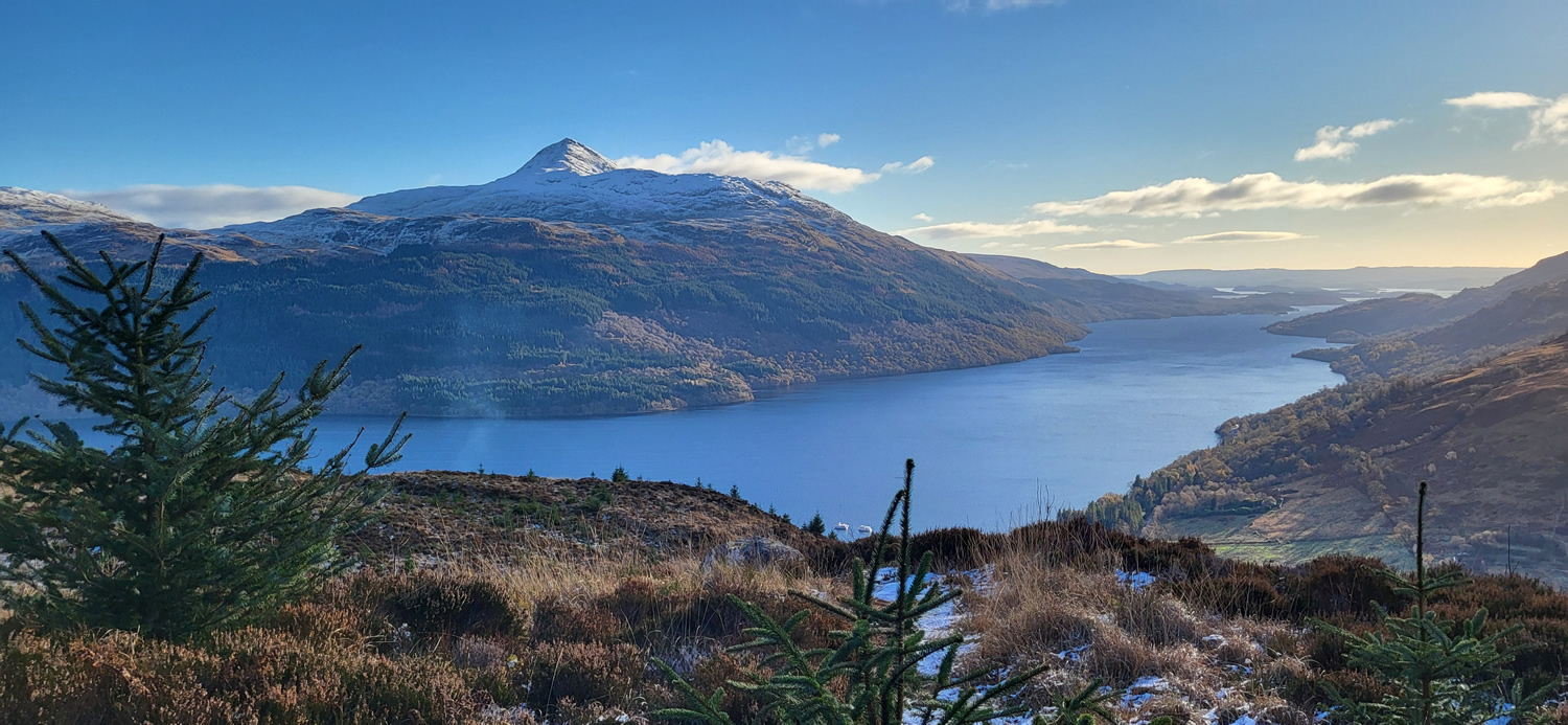 We would liked to have made a circular route, however after a short survey to the east of the summit, it became obvious that no direct route was available, and the lower forestry work may well have proven difficult to traverse, and so after a very leisurely break we returned to the summit area and simply retraced our steps back down the snowy hillside, through the forest and back to the car park, where we were grateful to see that the Slanj, or rather Kirk o’ the Lochs as it is now known was open just beckoning us for a coffee and a comfortable seat on their leather sofas.