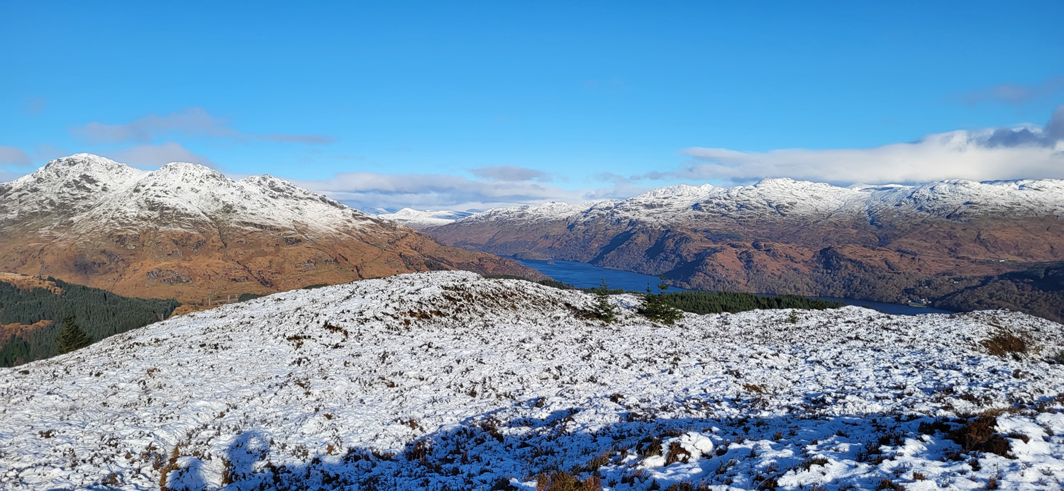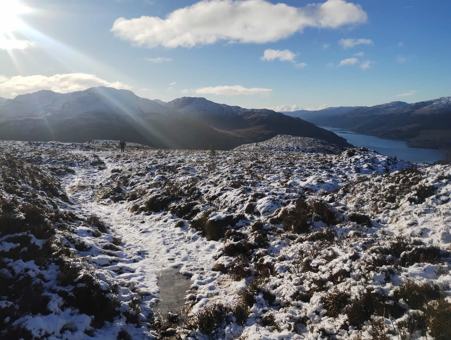 As we gained height we crossed the snow line with a rough covering now lying atop the heather and grasses, and with height came some wonderful views, especially over to the Arrochar Alps where the higher hills had an early winter covering of snow that looked considerably deeper than that which we were currently walking through. Cruach Tairbeirt is a beautiful little hill with an interesting approach as the narrow track winds and climbs up and around some rocky knolls, before a final flatter approach to the summit trig point. On our ascent we had been sheltered from the northwest wind that was blowing, but the moment we popped our heads onto the summit area the bitterly cold wind made it’s presence known with a vengeance, and so once the summit photos were taken, we skuttled back down below the wind blown summit and contemplated how we would make our return.