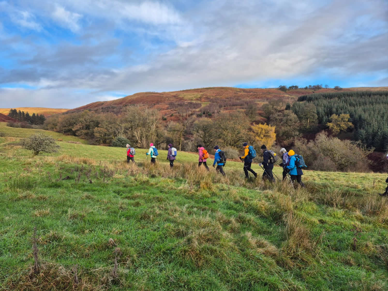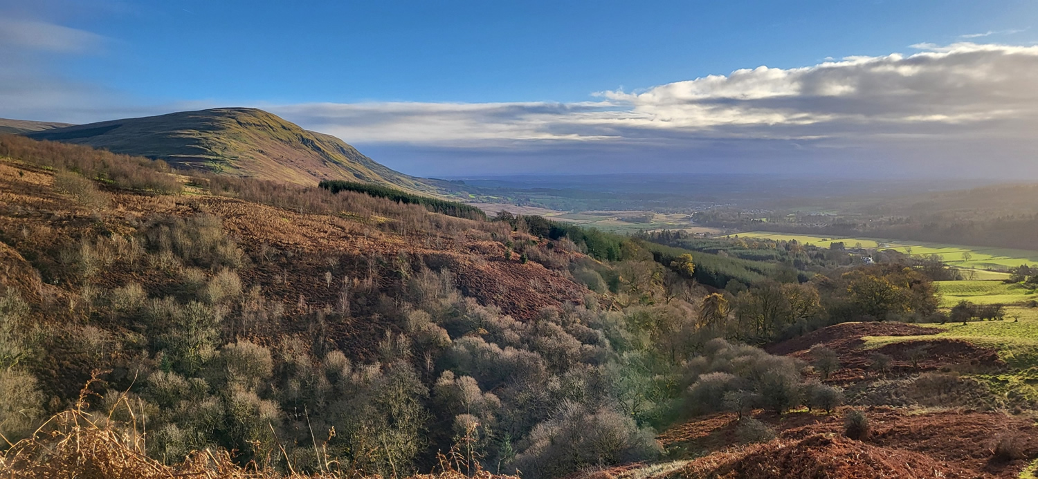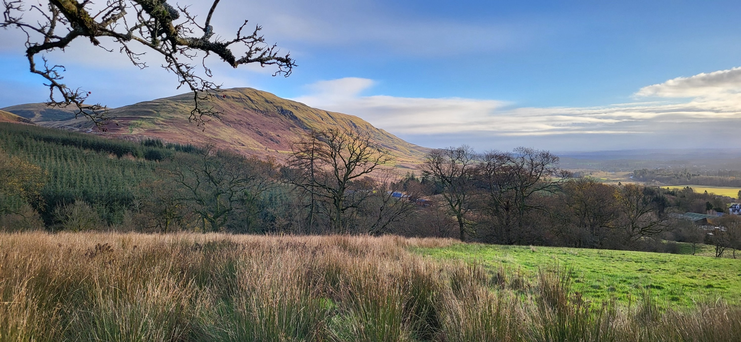 We left the car park at Clachan of Campsie and after a short walk along the roadside we turned north along a farm access track and were soon crossing the lush green fields of the lower pastures on the west side of Fin Glen. The green fields and farm gates quickly morphed into drystone walls and bracken through which a narrow path was easily followed as it rose above Finglen Burn with it’s waterfalls all of which remained unseen by us as the density of the woodlands in the glen below obscured anything below their thick canopy of branches in winter colours. On the ridge itself however two prominent markers were clearly visible, a ruin of standing walls indicated a substantial dwelling had at some time dominated the hill above the pastures, and, a little further up the ridge, around the 230m height a metre high cairn, what it was marking, other than simply a point along the track was not obvious.