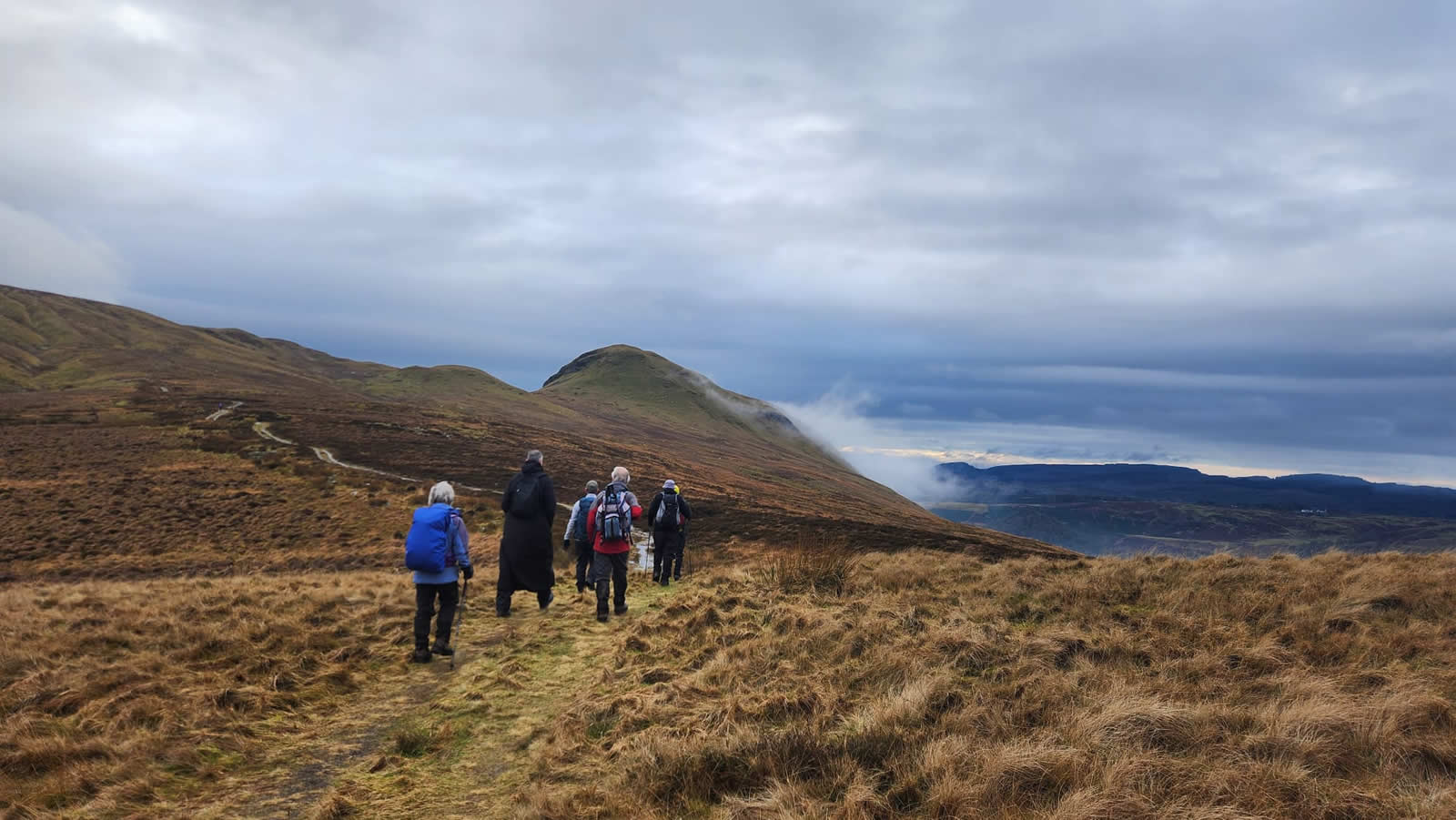 Leaving Killearn and walking through Kirkhouse Wood we ignored the right turn onto the main pipeline track and continued through the woodland alongside the boundary wall to the eastern edge of the woods to exit the woods onto the open moorland where the winter heather looked dark, almost black as it blanketed this stretch of moorland over which the narrowest of tracks, no more than a sheep-track, crossed the moorland to join up with the broader hillside path a kilometre or so away. We had left Killearn in a slight drizzle, but as we joined the hillside track and paused for a moment, confidence was growing in better weather ahead as was evidenced by the number of people discarding waterproof layers in anticipation of drier weather ahead.