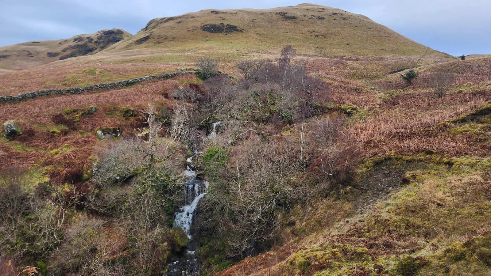 Refreshed and fit for the off, we descended the grassy, pathless hillside between Dumgoyne and Dumfoyn contouring southeast below Dumfoyn to pick up yet another narrow track leading to the un-named burn in Cauldhame Glen, across which we linked up with the track down the east side of the burn, passing an impressive waterfall enroute as we made our way downhill on what was probable the most awkward section of the whole route. Awkward in that the ground underfoot was short, wet grass on a bed of mud which required a little concentration to avoid any sudden mishaps which would leave one scrabbling around in a muddy bath. We emerged from the glen onto the “pipeline” track above Craigbrock for what was then a simple leg stretch back along the course of the pipeline to Killearn.