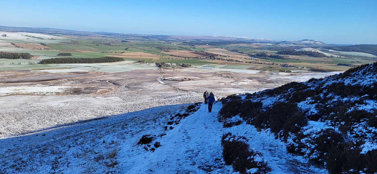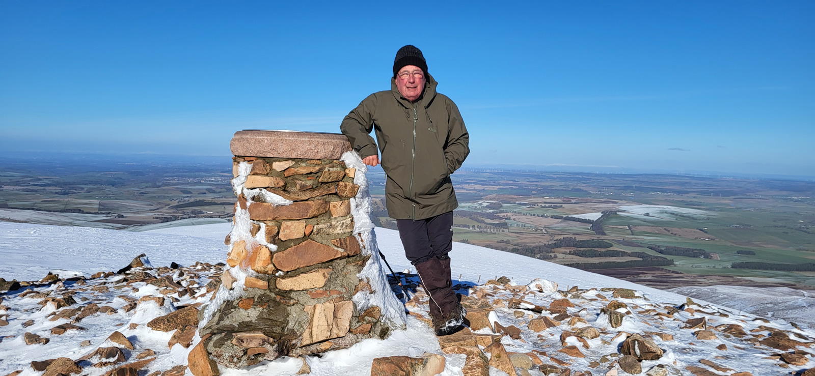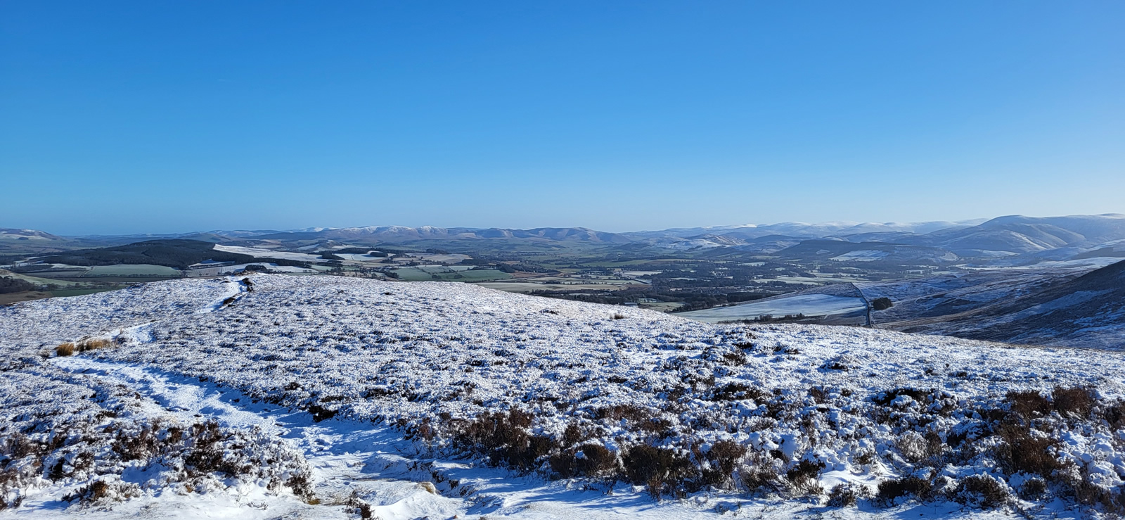 The north shoulder route has a climb of just over 500m, yet the gradient of the path ahead never looked more than a fairly shallow ascent, and so height is gained at a very steady pace, great for a day such as today when the air is crisp, snow underfoot and visibility in excess of 50kms, a day of leisurely walking to be enjoyed for all that is on offer. As stated earlier, Tinto is a popular hill, and so it was today, with the usual variety of walkers and their varied modes of dress; and this is where being prepared pays dividends. The climb up was sheltered, calm and sunny, yet on reaching the summit there was a sudden changing of the temperatures as a fairly cold wind suddenly hit you. Others, slightly ahead of us, turned and scampered off the top enroute back downhill passing us and warning of the cold winds. But we were prepared, no problem, and why would you rush away, the views were stunning and it was simply a matter of digging out that extra layer of warm clothing from our rucksacks and finding a nice spot to sit and enjoy the break and hills around us, warm and cosy in our extra layers, simple!