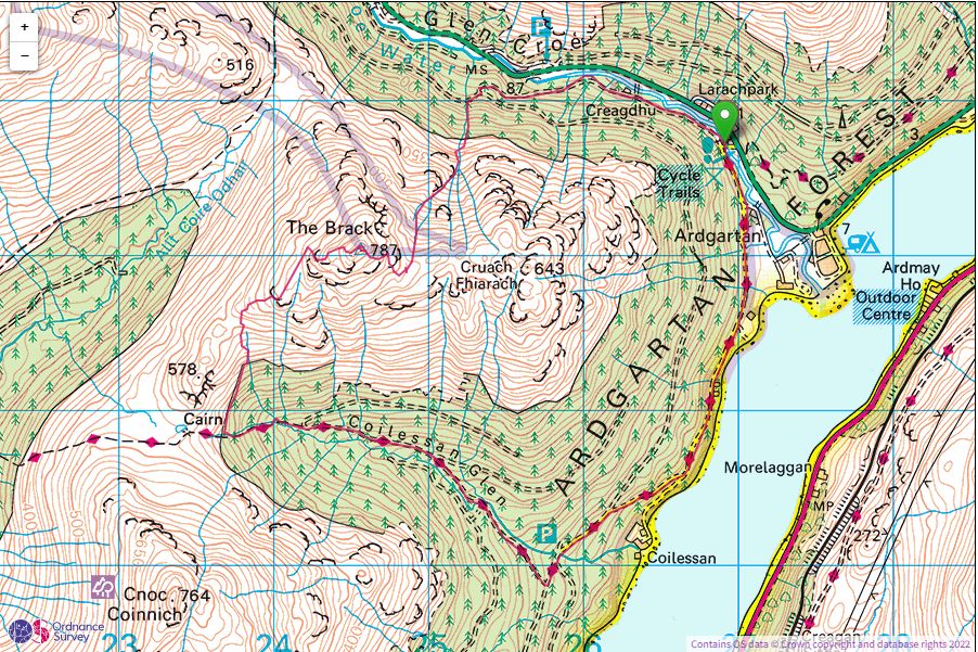 After a very welcome lunch on the summit, we descended via the long south southwest ridge heading towards the forest boundary and the Cowal Way which would take us along Coilessan Glen until we reached the minor road at the mouth of the glen, and thence back along the shoreline to Ardgartan.