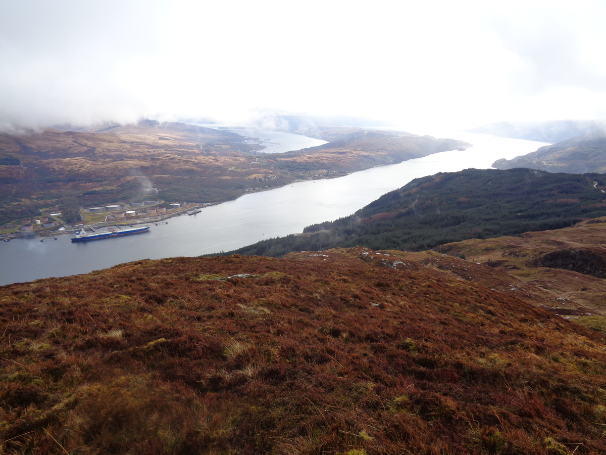 We lingered a little as we approached the summit to take in the views southeast over Loch Long and Gare Loch before heading over to the top where the obvious feature is the cairn, which takes on a "Leaning Tower of Pisa" effect, it's base being on a rock that is anything but horizontal; although we didn't loiter here very long, as the temperature took a sudden dip, and, with the increasing wind, the weather was once again taking a turn for the worse.