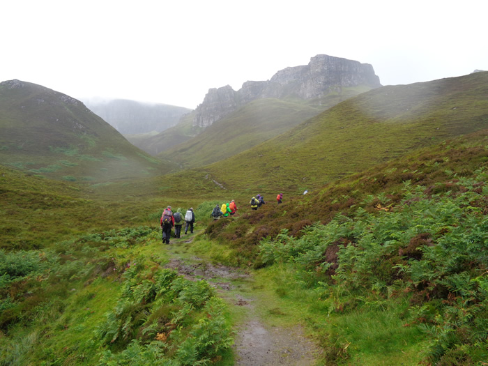Situated at the northern end of the Trotternish Ridge, The Quiraing was our starting point for this years Skye 2015 gathering hosted as ever by Brian at the newly refurbished Glen Brittle Memorial Hut. Day 1 dawned dull, wet and very grey looking, (nothing new there then!), but everyone was in high spirits as we set off on various forms of transport to make the journey from Glen Brittle to Staffin in the north of the island. Ignoring the more usual starting point from the car-park at the high bealach above Brogaig, we continued north to the hamlet of Digg from where, a short walk along the road brought us to the pathway leading towards Loch Langaig.