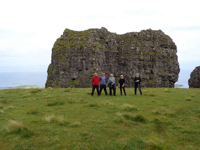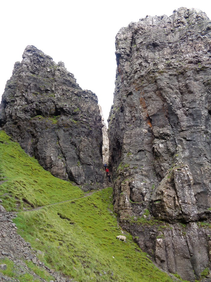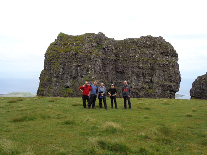 A relatively easy stroll along the grassy top of the escarpment allowed us to enjoy the views as we descended towards the southern end of the Quiraing before swinging north once again to transit below the crags towards the very prominent landmarks of The Needle and The Prison, two mighty columns of rock that straddle the bealach, beyond which lies the hidden jewel of The Table. Leaving our packs at the bealach, we made the climb up the very steep, grassy slopes to the rock columns guarding The Table, before scramble up, between the steep columns and onto the flat, grass area that forms this quite amazing feature. We completed the circuit from the bealach by rejoining the path below Lean nan Fionn for our return to Loch Langaig and the end of a walk through a quite wonderful landscape.
