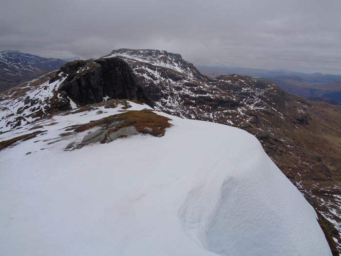 We departed the ridge and made the final climb to the summit, where the low cloud cleared sufficiently for us to get some reasonable views of the neighbouring summits, and down beyond Loch Long towards the southern banks of the River Clyde. We decided to make our descent down the "tourist" path, where once again, we were reminded why the extra weight of crampons and ice axes are worth the effort, as we made light work of the descent, whilst others, some ascending, others descending, seemed to be struggling, and making very heavy going over the slippery, snow covered surface.