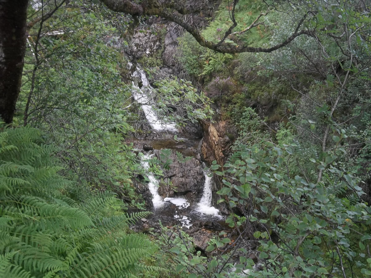 Although the way ahead was through fairly open woodland, the ground beneath the trees was of deep grass and bracken, wet and undulating, making for unpleasant going, however, it was not for long and we were soon standing by the impressive gully through which the Allt Coire Dubhchraig passes - but with no bridge to be seen; and, with no chance of crossing the gully at this point due to its steep, tree and rock lined slopes. So, it was on uphill through the trees, with the gully becoming less steep as we gained height until, just a short distance further along we finally crossed the waters of the Allt Coire Dubhchraig. Continuing to follow the course of the Allt Coire Dubhchraig, we made a steady climb up towards the ridge on the skyline and the lochans that are the source of the river, on the way passing a number of waterfalls that are a feature of this very picturesque river as it tumbles down the grassy hillside.
