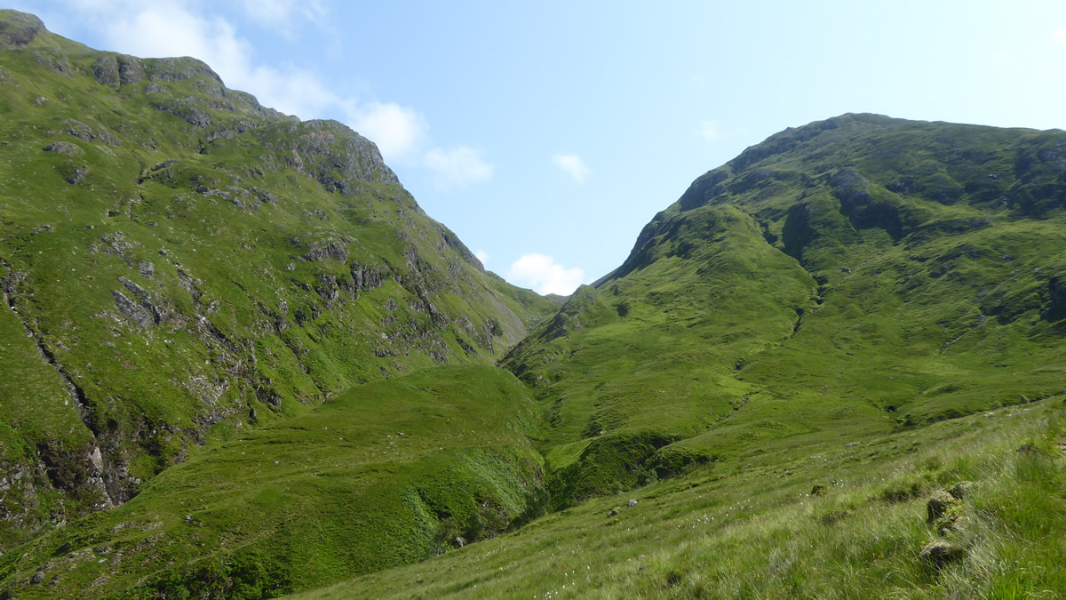 After the steeply rising zigzag path we took the left fork, still climbing to the Bealach an Sgairne at 500m, which is marked by a large cairn, and has great views east and west, and best of all, a lovely cooling breeze. After a short break here, we dropped 120m to the Loch a Bhealaich, knowing we had to reclimb this on our return. Normally the ground around the head of the loch is boggy, but we were lucky, as it was virtually dry after the long spell of amazing weather. A line of old fence posts marks the route up the steep south side of Sgurr Gaorsaic. It was a bit of a trudge but eventually we made the top. The lochan near the top was virtually dry and we had to search for the rather insignificant cairn. Lovely views of the nearby Munros and a 2nd lunch at the cairn at 3.30pm raised our spirits – Beinn Fhada, A Ghlas Bheinn and Sgurr nan Ceathramhnan, and the Cuillins on Skye just peeking above a line of cloud.