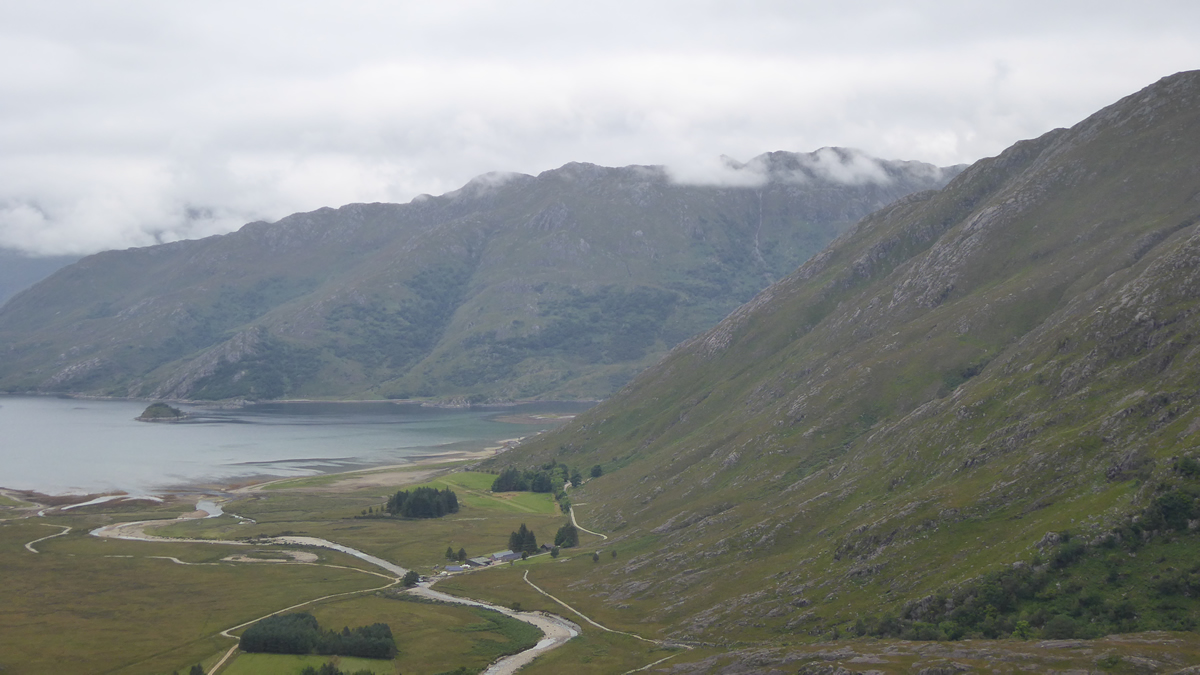 This Corbett, which is only one metre short of a Munro, lies in a very remote and beautiful area, the Knoydart Peninsula, and there are different routes into the start, from Inverie in the west or from the end of Loch Quoich road at Kinlochhourn in the east but these involve very long walks to the start, so we chose the shortest, and easiest, and arguably the one which made the day an adventure. We chose to take the boat from Arnisdale to Barrisdale with the boatman, Peter Fletcher, a charming local man who had worked abroad as well as in Inverness and who was full of chat. Involving a third party always seems to add frustration to organising a trip, and this was no exception. Several messages left on answer machines and at last a date and time was made to meet up in Arnisdale. The high pressure was still settled over Scotland but as the days wore on while we waited for a reply, the cloud cover was mentioned more often, but we decided we would chance it.