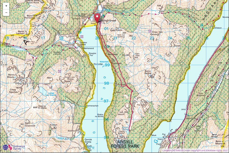 We left the shore line car park at Lochgoilhead and headed up through the village to pick up the high level forestry track which makes a gradual rising contour southwards through the forest for a few kilometres to a fork, where, branching left uphill the track narrows to a single file, but still very obvious path as it continues to climb with a few short descents and then re-ascends onwards up through the forest. Its an interesting path with minor rocky streams, a few small waterfalls and some old wooden bridges to cross enroute to the high point at about 320m.