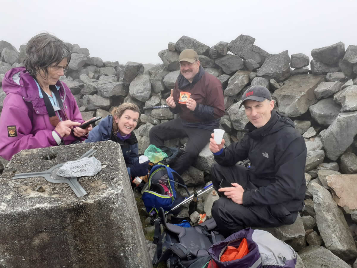 I asked the question “Do you want to go back” and heard Ben say “I haven’t driven 500 miles to turn back now!”. So compasses out and a bearing taken to try and get back on track. We reckoned 2.5 hours to the top, and there was silence from the Team! Essentially what we then did was climb up the route that walkers and fell runners take when they come off the top in a south direction. How the runners do this I do not know! The cloud completely shrouded the hills which made route finding awkward, but Ben came across a reasonable path that led us through the rocks. It was steep and tricky through scree and boulders and with a strong wind in places too, but at least blowing us onto the mountain and away from a steep gulley! I saw little flowers of yellow golden rod clinging in a crevice and the flowers of common cow-wheat(?) which lifted the spirits. I heard Gareth muttering “I hate scree, I love bog, only to be repeated later with I hate bog I love scree”. Eventually the shelter surrounding the trig point came into view – hooray we had made it. I led the way and at last at 3.30pm we sheltered from the wind and opened the champagne. What a relief, we were there and safe. It was quite an emotional moment. Les had organised a T shirt with pictures of hills on it but it was too wet to put on – such a shame. Alex had brought a congratulatory hand painted stone covered with dates of hills climbed to leave on the cairn. I was quite overwhelmed by their kindness.It was time to leave the shelter so we took a bearing and started the descent and I heard Ben say “It’s like a runway”. There was a path through the rocks edged with stones heading downhill. This was constructed by the Ordnance Survey men who were mapping the Highlands and Islands in the 19th century. At last as we neared the bealach the cloud lifted a bit and we could see the loch and then the sea, but still no sign of our mountain. We saw a few deer and plenty of frogs. As we retraced our steps and crossed the stepping stones again, we could hear stonechats and skylarks. At 7pm we reached sanctuary, the car, and drove back to the cottage. What a surprise awaited us. Disco lights were flashing and dance music was playing, balloons festooned around and the table all set with a beautiful celebration cake. It was a very special moment, and I have my family and friends to thank for helping me to complete the Corbetts. It is a day I will always remember.