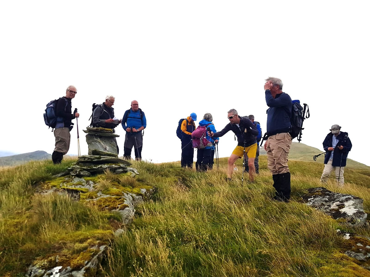 Once again I settled myself on a small rocky knoll and just enjoyed the solitude and the views, which, contrary to the weather forecast were beginning to fade as a low cloud drifted in, and just before it covered the high point of the groups descent route suddenly ant like figures appeared on the skyline, to distant to count, but a large group, and given that they were thirteen strong there was not doubt it must be them, you are lucky to see one other walker on these quiet hills, never mind another large group. I watched them make their descent, disappearing at times in the swirling low cloud until they dropped low enough to stay below its shadow until they joined me on Cruach na Cioba. Rather than return to the 540m bealach, we departed the summit of Cruach na Cioba on a direct bearing to rejoin the Cowel Way at the point at which I had left it for my ascent sometime earlier.