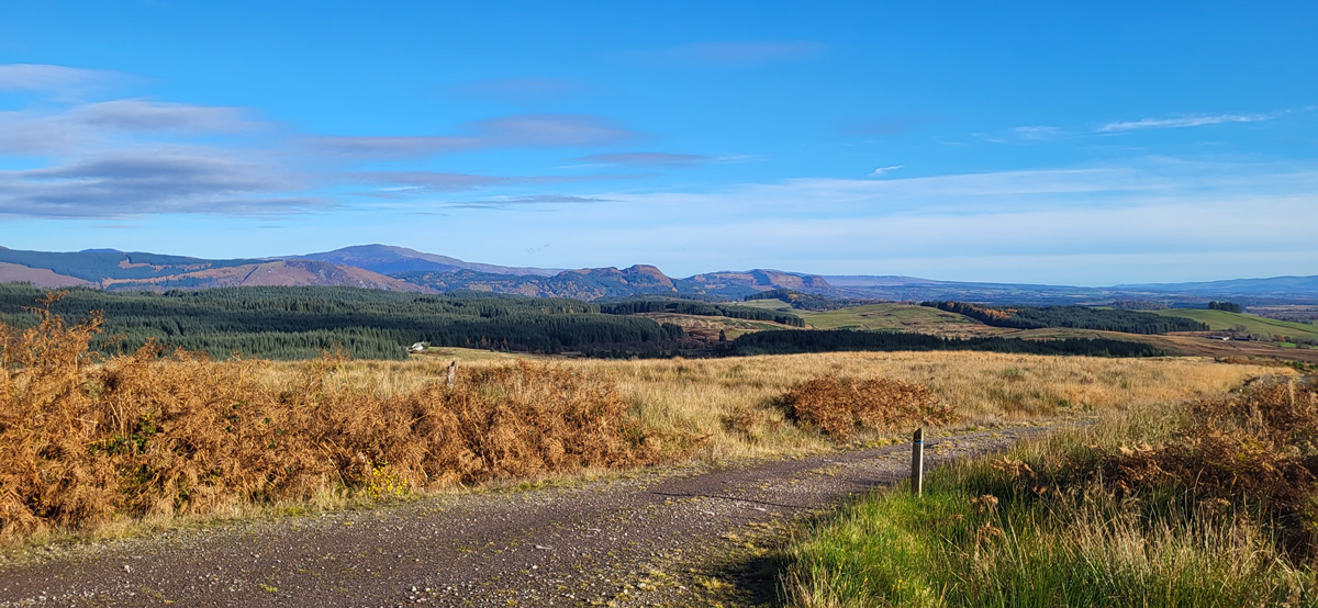 Leaving the car park at Drymen Cottage we took the southern-most track through the forest, and for the next five kilometres strolled briskly along the fine path enjoying the views north and east over the open landscape. Views which included Ben Lomond, Ben Ledi and in the far distance, away to the east the Wallace Monument was clearly visible in the bright blue November skyline. Shortly after the five kilometre point we took a short break at the point at which we would leave the forest track behind and begin the climb towards the summit of Gualann