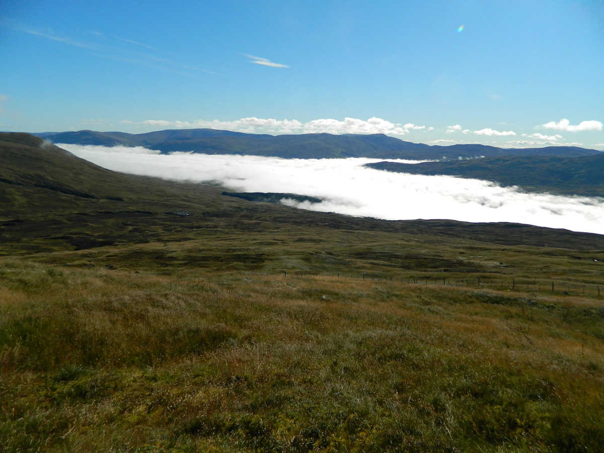 The path continues immediately across the main track, switching and heading generally west as it heads towards the nose of the southern ridge of the un-named top at 923m. The nose is reached at around the 720m height, and the path again switches direction as it heads north towards the 923m top. Throughout, it is a relatively gently climb, on a narrow, but good and well maintained path over the heather and grass slopes. The views over Loch Tay and the Lawers Range open up as you gain height, and on a clear day as it was, offered quite a contrast. Loch Tay being completely covered in a low autumn mist, while the Lawers Range was lit up by the crisp morning sun and clear blue sky.