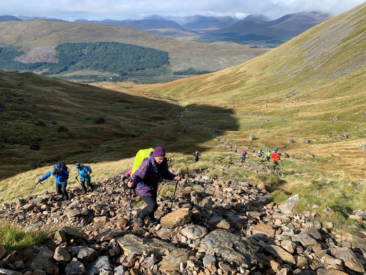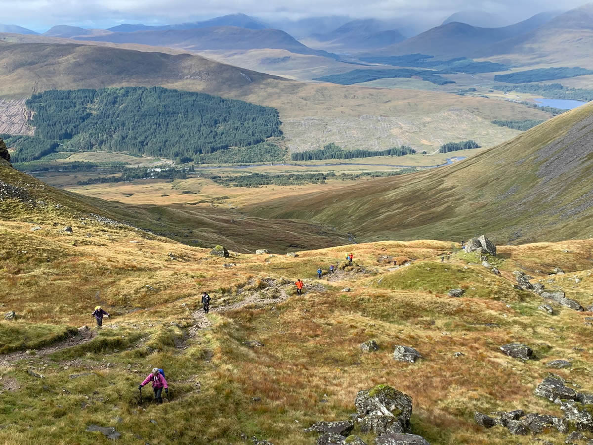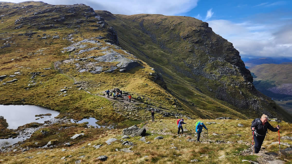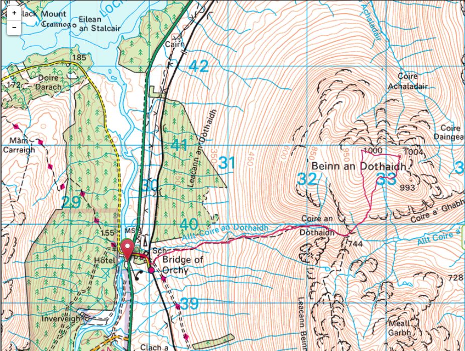 As we stood up from our lunch spot, whom should we see but our group now making the short descent from the south top towards the main descent path, and so we simply walked a few paces further to rejoin them on the descent path, leaving the south top, just a short distance away but unvisited on this occasion. Beinn an Dothaidh and Beinn Dorain are mountains with little option but to approach and return via Coire an Dothaidh, and so the effort required to climb the rocky path from Bridge of Orchy to the 744m bealach has to be translated into an effort in concentration as you make the long descent over some very awkward ground until you are at least well down the coire and Bridge of Orchy comes into sight, and a very welcome sight it is at the end of yet another fantastic, but energetic day in the hills.