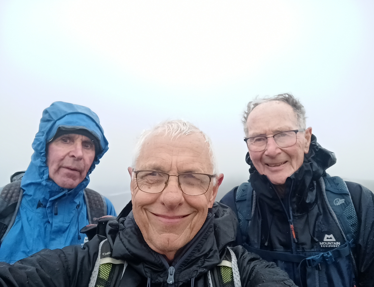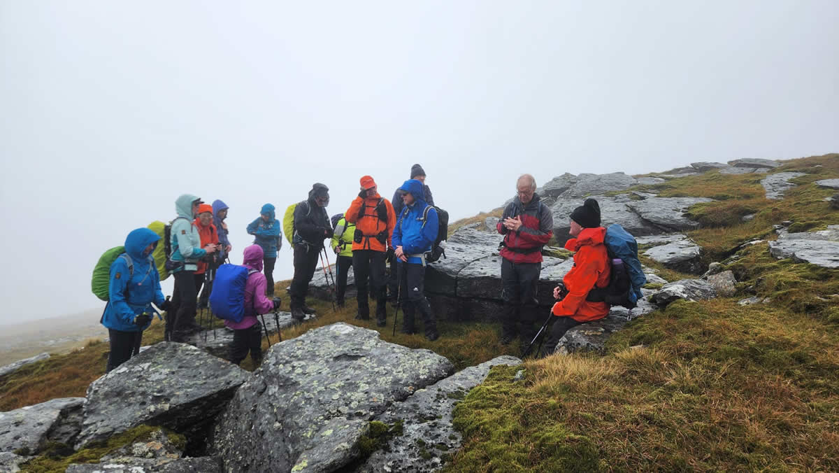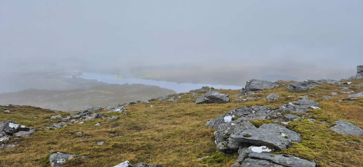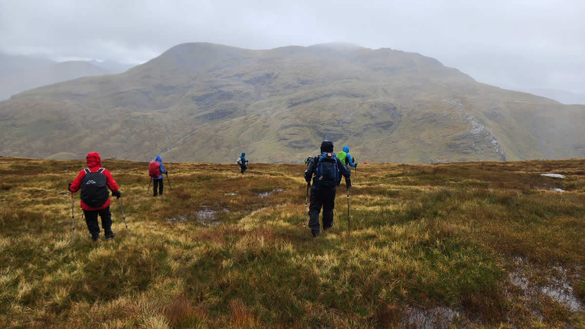 We were a large group, and as the majority set off for the climb away from the bealach, I was happy to wait a little longer before following, as were Mike and Peter, and so we three waited a few moments longer before following the group up to the marker cairn, where, as we arrived they were just about to disappear into the mist on the hill ahead of us enroute to the 1000m west top. As we followed on, we had occasional glimpses of the group ahead bobbing in and out of the mist, but by the time we arrived at the 1000m top they were nowhere to be seen. A lone walker, huddled behind the rocks informed us that they had been and gone a few moments ago. The mist had now turned to fairly heavy rain and the wind was picking up, so it was time to don full waterproofs before setting of across the fine plateau for the short walk to the main top and summit of Beinn an Dothaidh at 1004m. As we reached the summit, there again just bobbing into the mist were our main group now approaching the top of the minor south top, but, it was time for lunch, so here the pursuit ended, we took a “selfie” summit photo and then found ourselves a sheltered spot and hunkered down for a much appreciated break and refreshments.