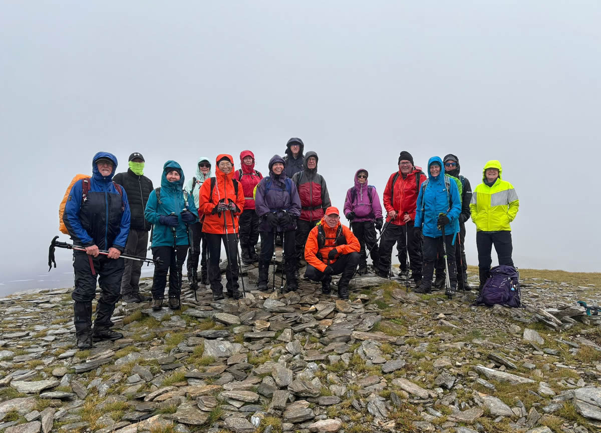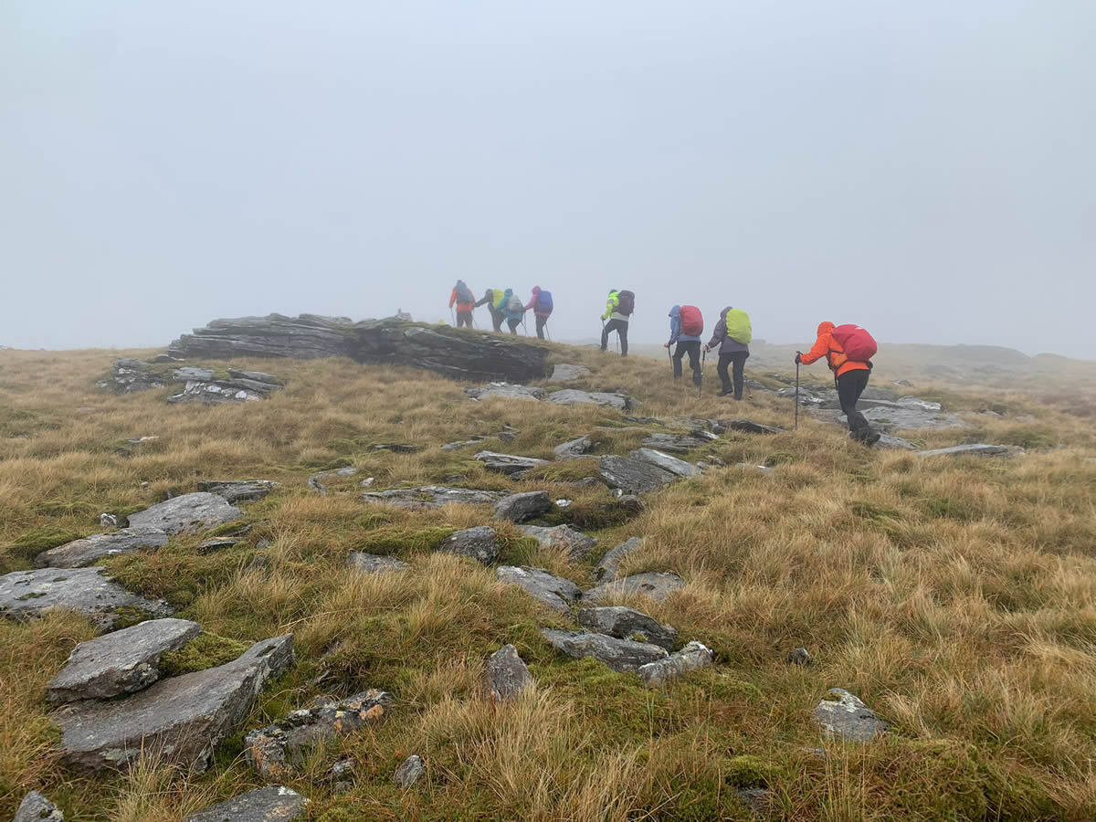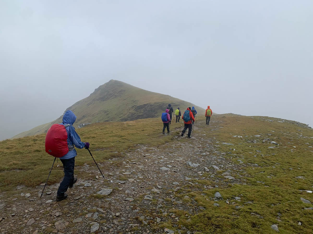 We were a large group, and as the majority set off for the climb away from the bealach, I was happy to wait a little longer before following, as were Mike and Peter, and so we three waited a few moments longer before following the group up to the marker cairn, where, as we arrived they were just about to disappear into the mist on the hill ahead of us enroute to the 1000m west top. As we followed on, we had occasional glimpses of the group ahead bobbing in and out of the mist, but by the time we arrived at the 1000m top they were nowhere to be seen. A lone walker, huddled behind the rocks informed us that they had been and gone a few moments ago. The mist had now turned to fairly heavy rain and the wind was picking up, so it was time to don full waterproofs before setting of across the fine plateau for the short walk to the main top and summit of Beinn an Dothaidh at 1004m. As we reached the summit, there again just bobbing into the mist were our main group now approaching the top of the minor south top, but, it was time for lunch, so here the pursuit ended, we took a “selfie” summit photo and then found ourselves a sheltered spot and hunkered down for a much appreciated break and refreshments.