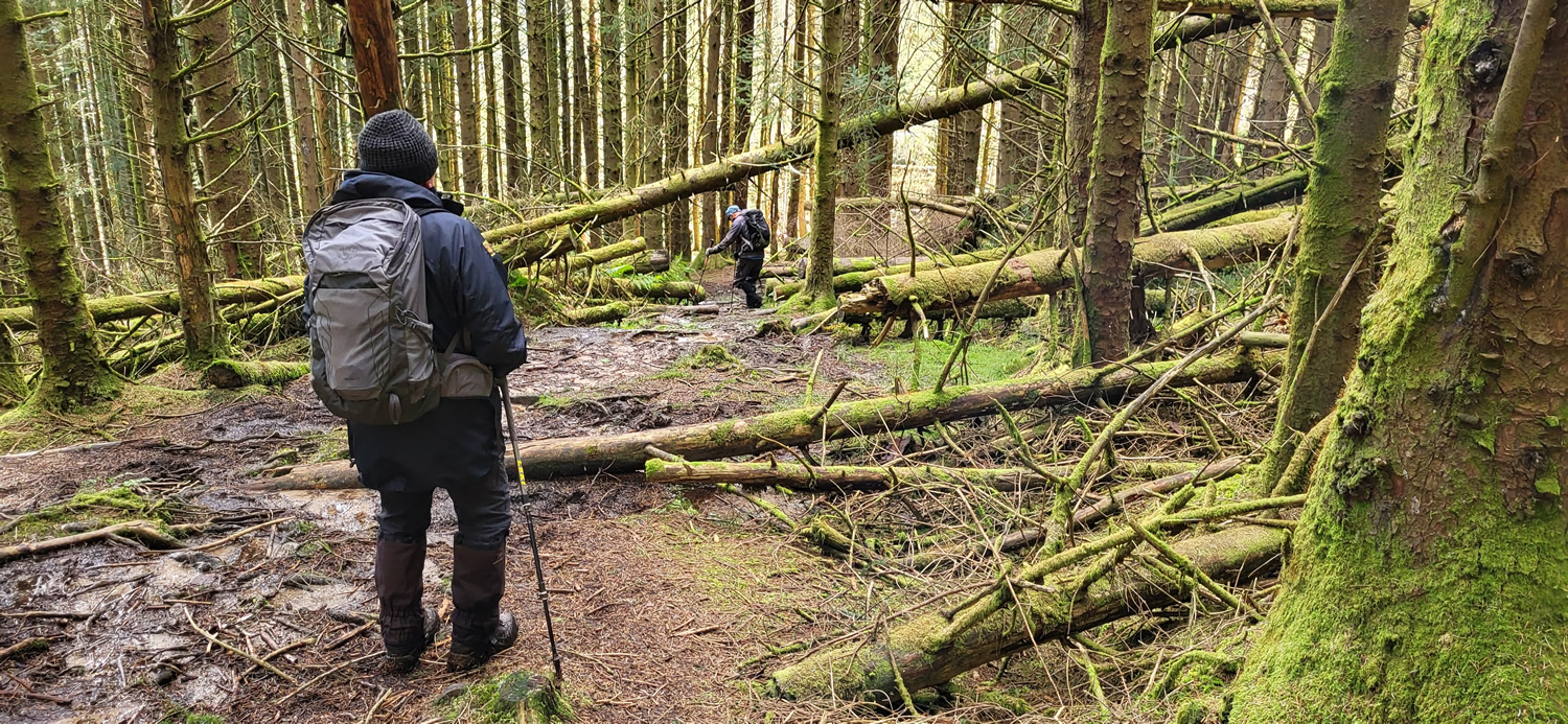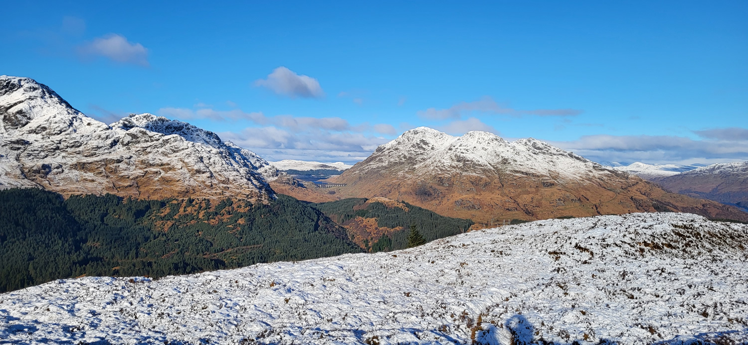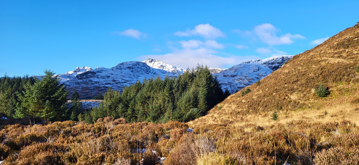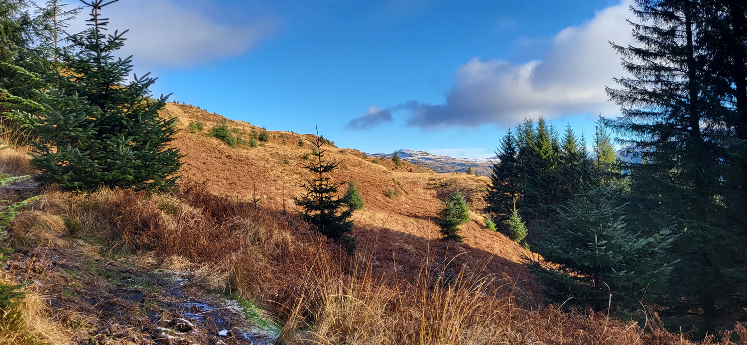 The plan for today was a recce for Mike’s upcoming Tullich Hill walk, but doubts as to driving up and along the Glen Douglas road given the overnight temperatures meant a plan B instead, a look to see how the forestry work on Cruach Tairbeirt was progressing. Leaving the Slanj car-park our change of plan was somewhat prudent as one side of the short section of road up to the station was covered in heavy ice where some lying water had obviously frozen solid, and Glen Douglas can be a bit of a wet road with water running off of the hillside at the best of times.