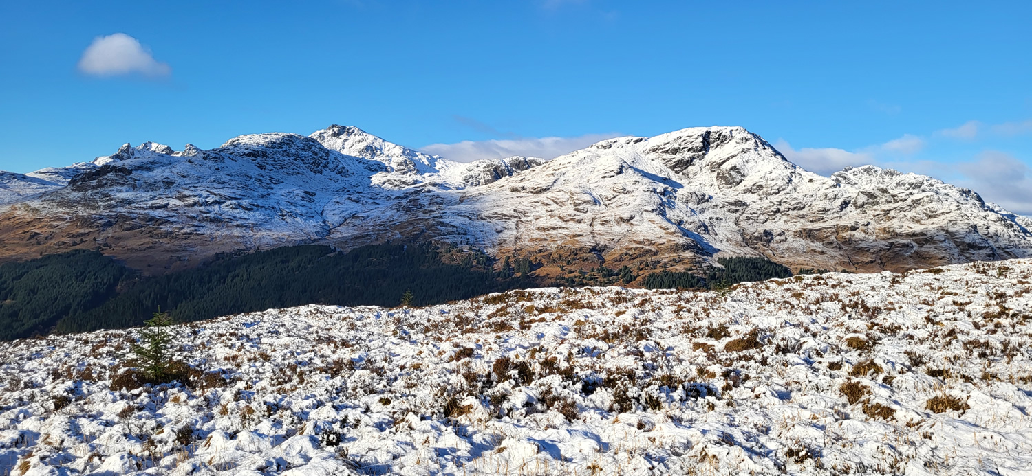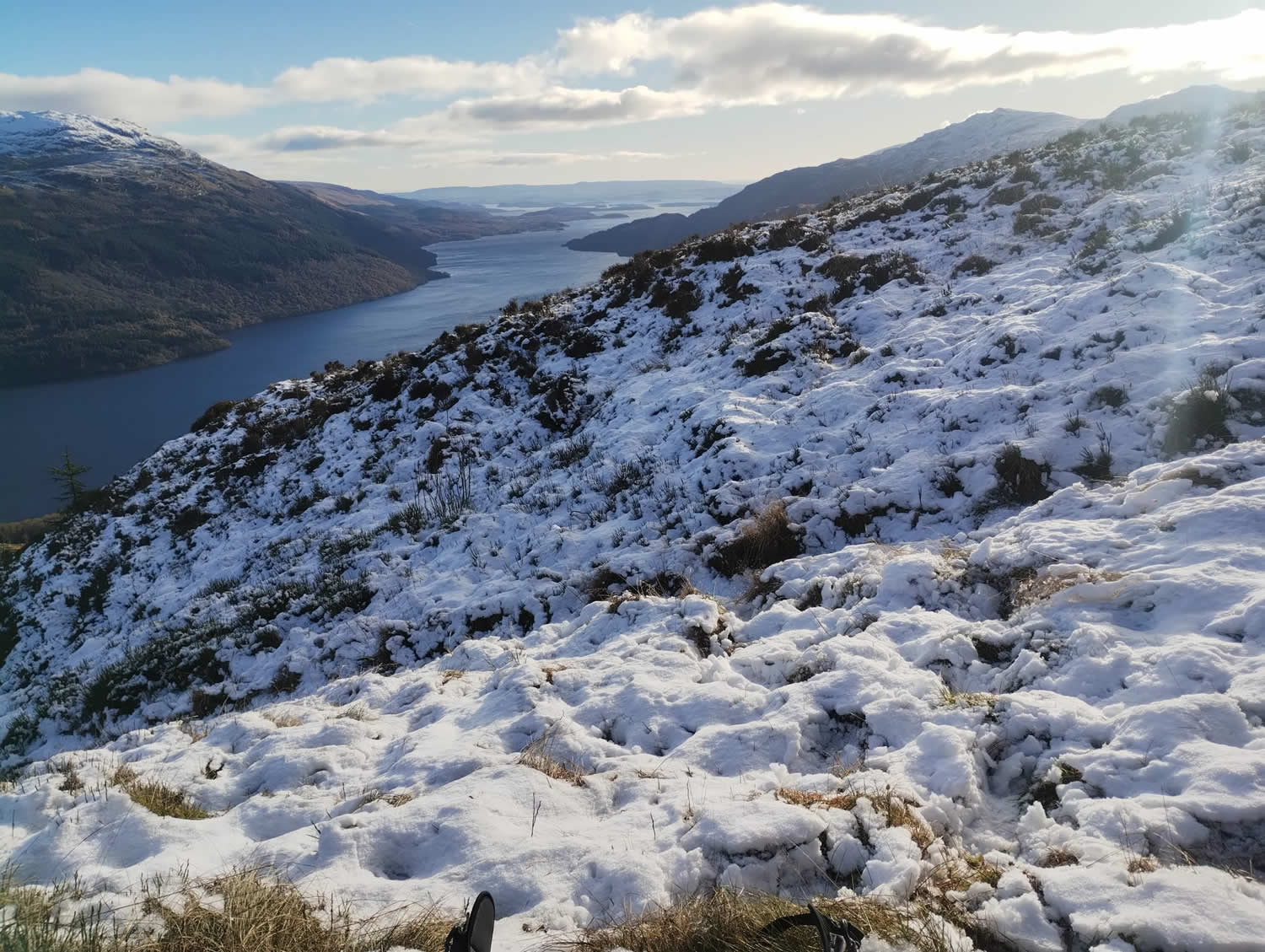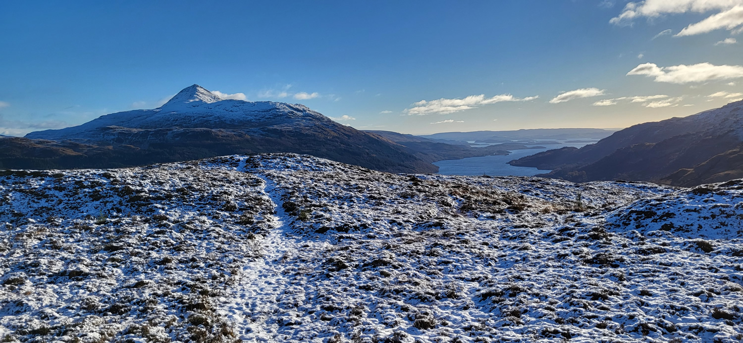 As we gained height we crossed the snow line with a rough covering now lying atop the heather and grasses, and with height came some wonderful views, especially over to the Arrochar Alps where the higher hills had an early winter covering of snow that looked considerably deeper than that which we were currently walking through. Cruach Tairbeirt is a beautiful little hill with an interesting approach as the narrow track winds and climbs up and around some rocky knolls, before a final flatter approach to the summit trig point. On our ascent we had been sheltered from the northwest wind that was blowing, but the moment we popped our heads onto the summit area the bitterly cold wind made it’s presence known with a vengeance, and so once the summit photos were taken, we skuttled back down below the wind blown summit and contemplated how we would make our return.