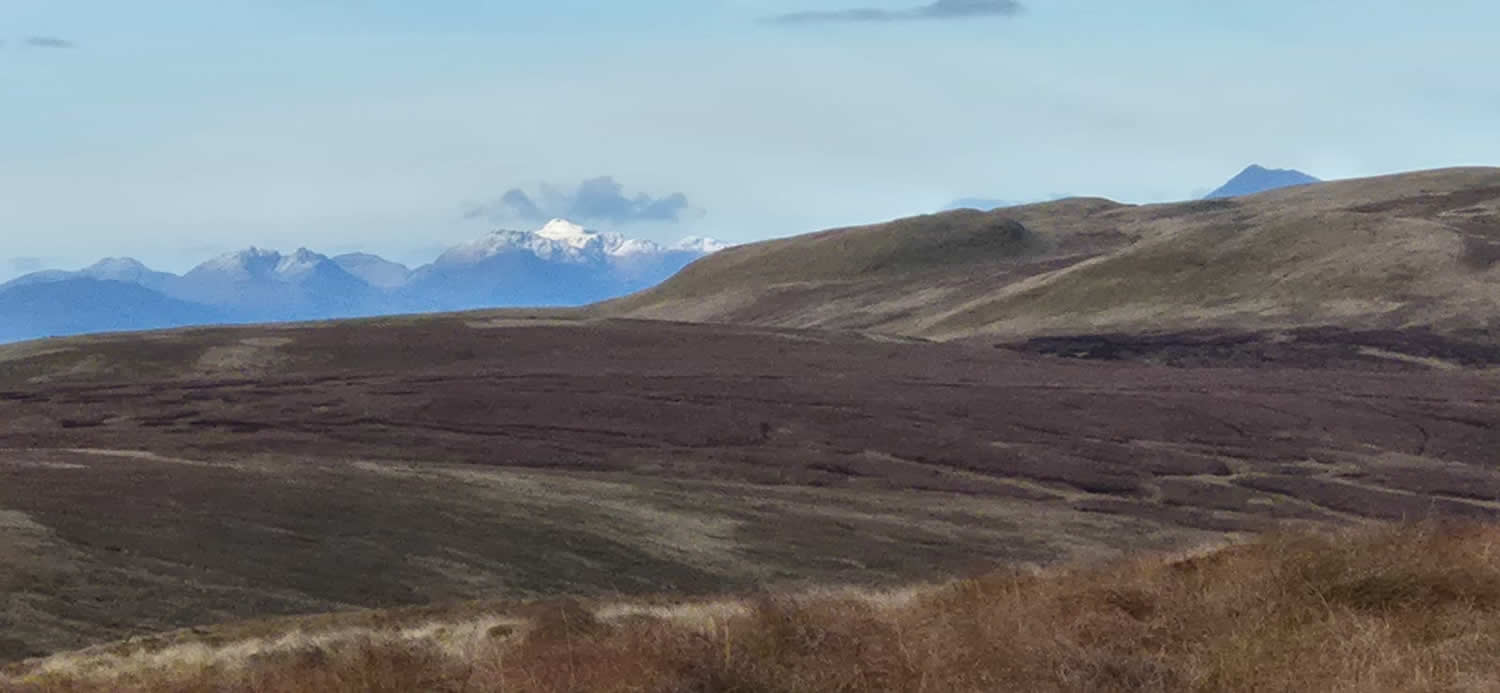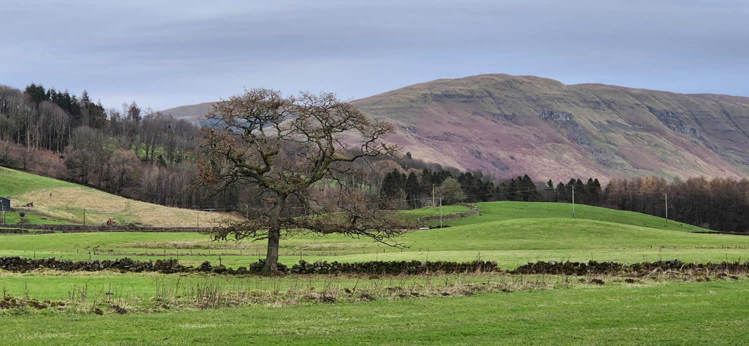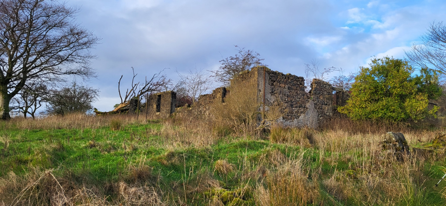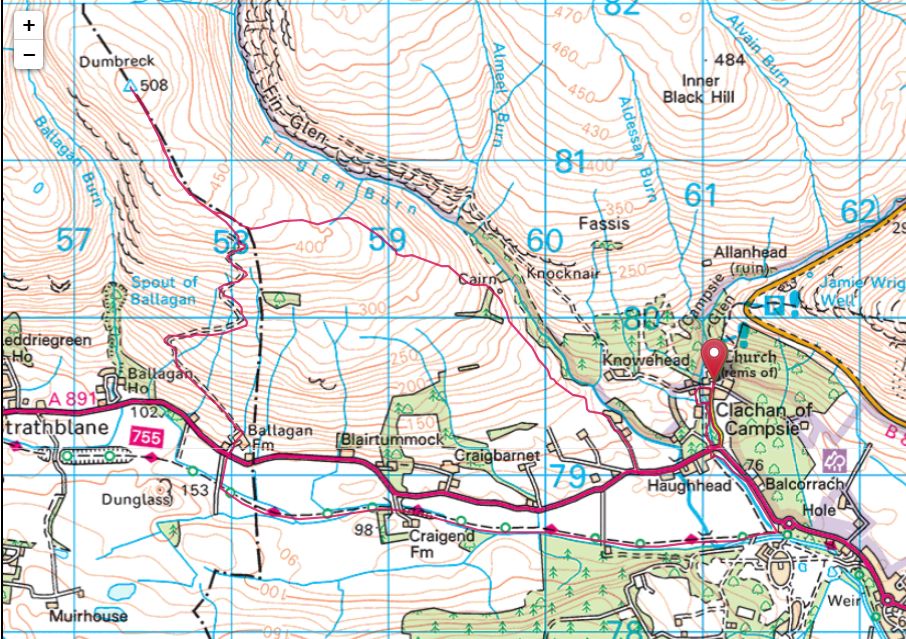 We left the car park at Clachan of Campsie and after a short walk along the roadside we turned north along a farm access track and were soon crossing the lush green fields of the lower pastures on the west side of Fin Glen. The green fields and farm gates quickly morphed into drystone walls and bracken through which a narrow path was easily followed as it rose above Finglen Burn with it’s waterfalls all of which remained unseen by us as the density of the woodlands in the glen below obscured anything below their thick canopy of branches in winter colours. On the ridge itself however two prominent markers were clearly visible, a ruin of standing walls indicated a substantial dwelling had at some time dominated the hill above the pastures, and, a little further up the ridge, around the 230m height a metre high cairn, what it was marking, other than simply a point along the track was not obvious.