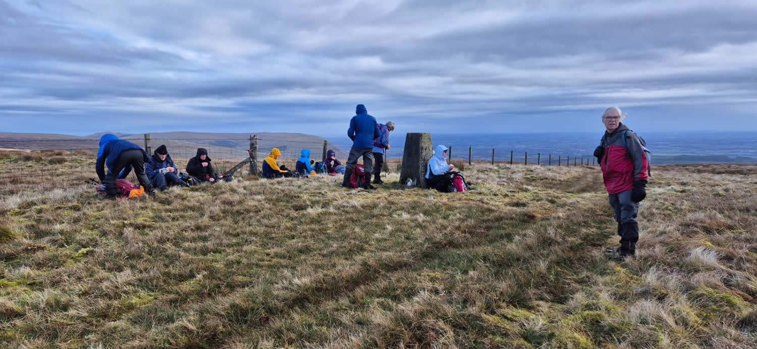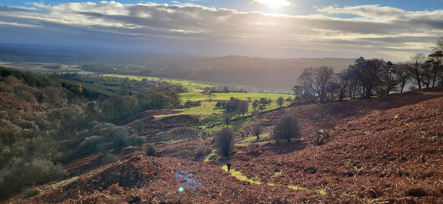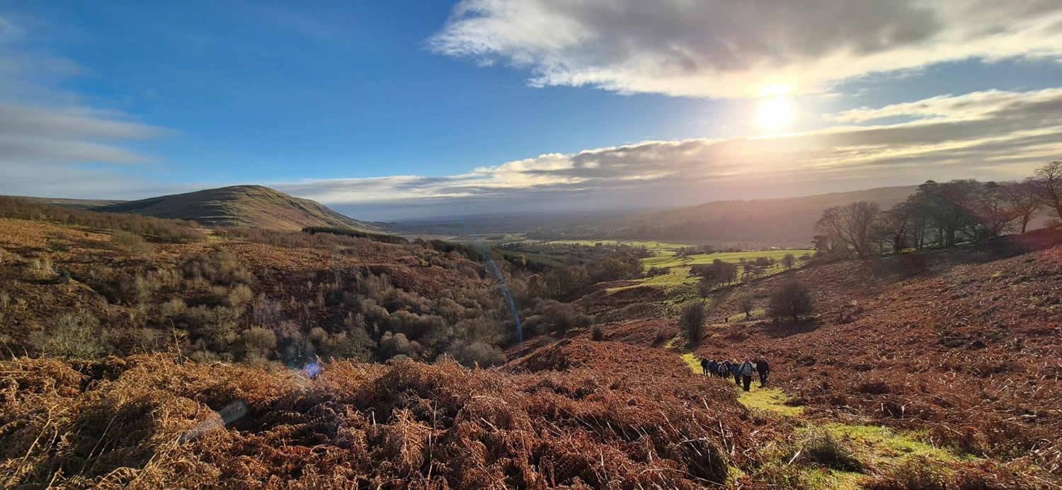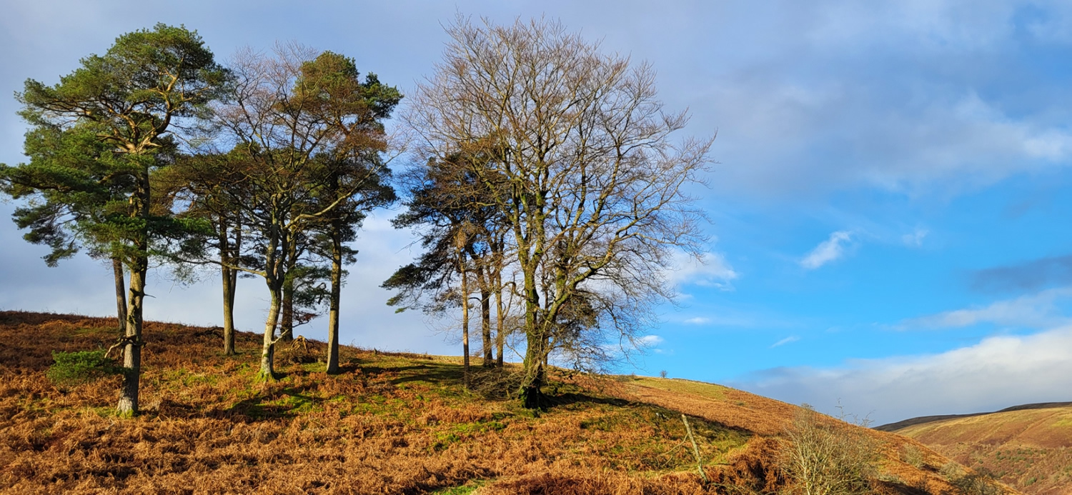 We left the car park at Clachan of Campsie and after a short walk along the roadside we turned north along a farm access track and were soon crossing the lush green fields of the lower pastures on the west side of Fin Glen. The green fields and farm gates quickly morphed into drystone walls and bracken through which a narrow path was easily followed as it rose above Finglen Burn with it’s waterfalls all of which remained unseen by us as the density of the woodlands in the glen below obscured anything below their thick canopy of branches in winter colours. On the ridge itself however two prominent markers were clearly visible, a ruin of standing walls indicated a substantial dwelling had at some time dominated the hill above the pastures, and, a little further up the ridge, around the 230m height a metre high cairn, what it was marking, other than simply a point along the track was not obvious.