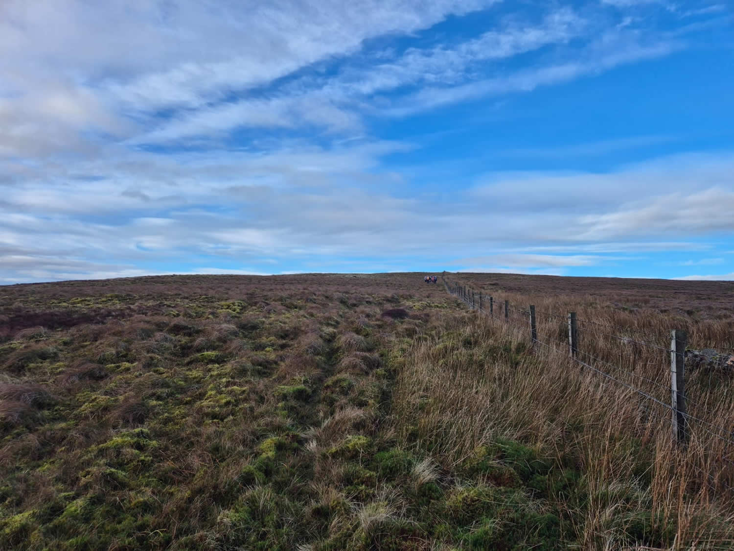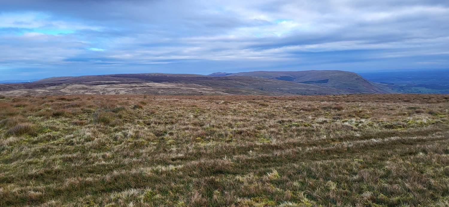 Across the 300m height and yet again a change underfoot, gone was the pleasant grassy track and we were now well into the deep tufts of grass and areas of sphagnum moss so common all over the higher ground of the Campsies, as are the fencelines that criss-cross the hillside. And it was now a matter of plodding along beside a fenceline, or cutting diagonally towards a fenceline as we made steady progress up the gentle slopes heading towards the as yet undistinguishable minor top as it blended into the open hillsides ahead. Eventually we met and joined the main track I mentioned earlier for those make a direct ascent to Earl’s Seat, and it was along this we wandered for the final kilometre to the cairn marking the 508m high summit of Dumbreck.