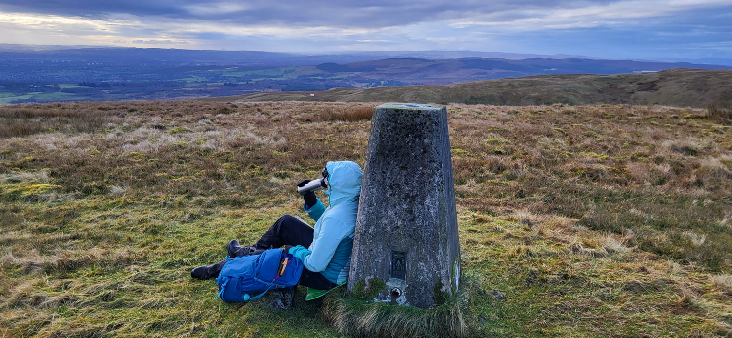 The weather was kind to us, as far as it being a beautiful dry day, with mainly clear skies and excellent visibility. However, there was a chilling northerly wind blowing which considerable added to the wind chill factor, especially over the exposed open hillsides, and so we lingered on the summit just long enough for a rather quick break before we set off on our descent towards the Strathkelvin Railway Path, a return route that took us back along the final kilometre we had just come, but then continuing on the main track and down the broad zig-zagging track which leads downhill to Ballagan Farm.