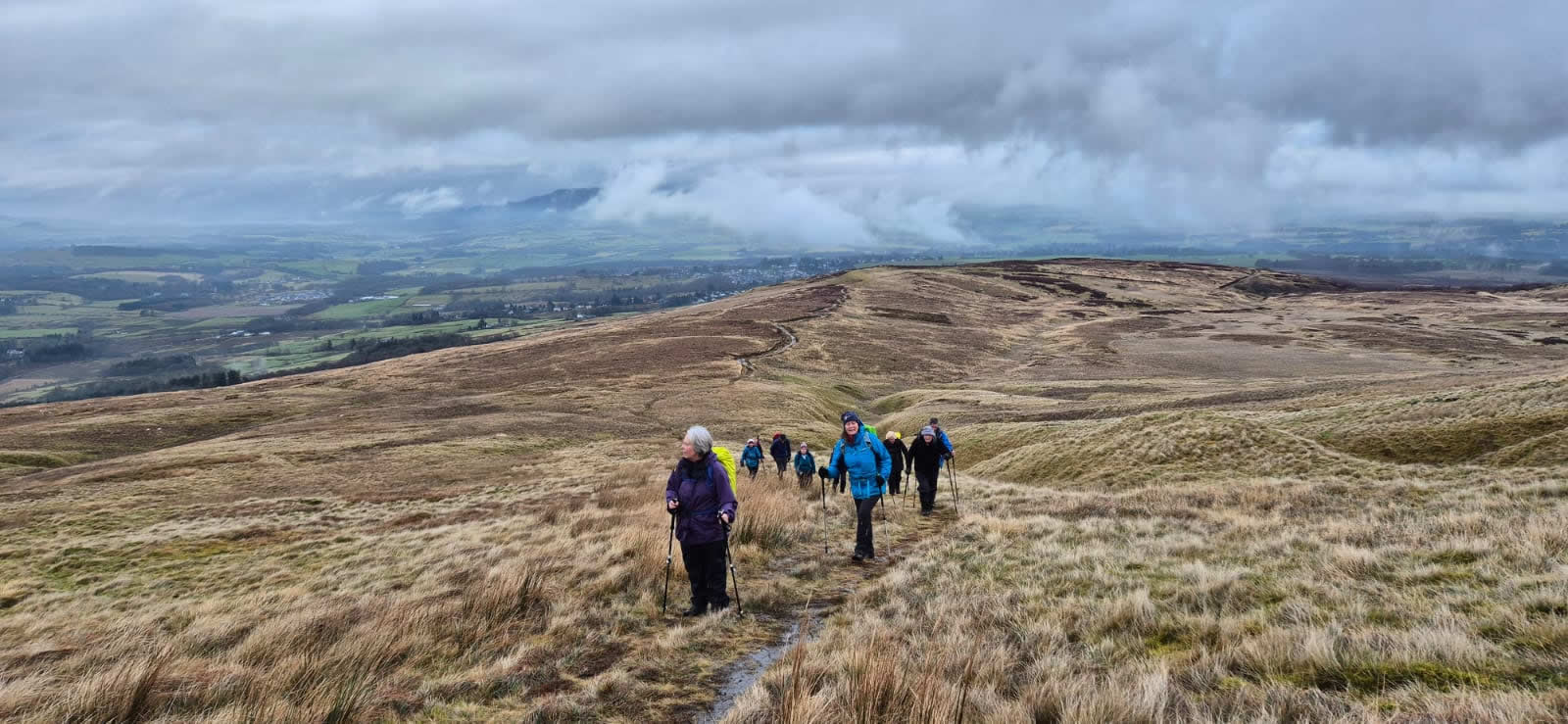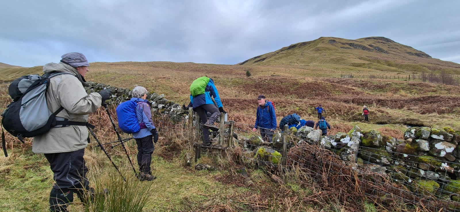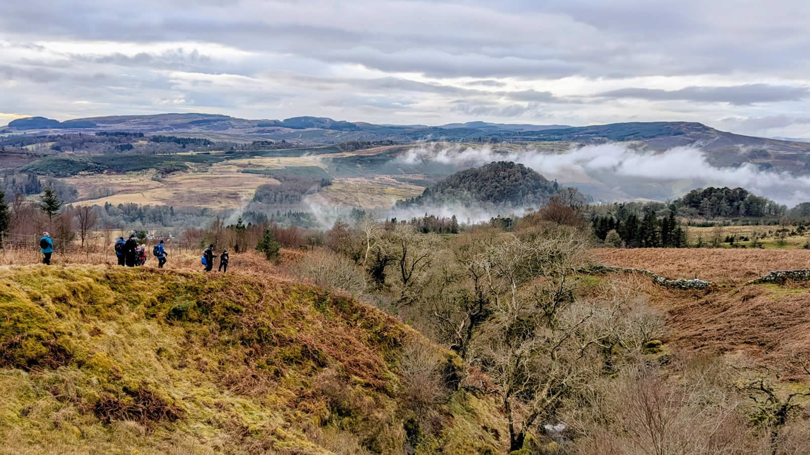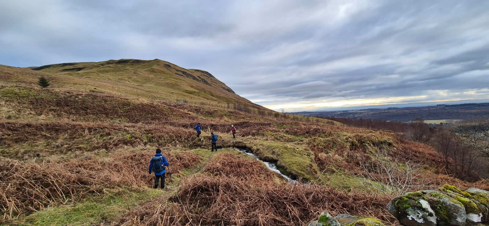 Leaving Killearn and walking through Kirkhouse Wood we ignored the right turn onto the main pipeline track and continued through the woodland alongside the boundary wall to the eastern edge of the woods to exit the woods onto the open moorland where the winter heather looked dark, almost black as it blanketed this stretch of moorland over which the narrowest of tracks, no more than a sheep-track, crossed the moorland to join up with the broader hillside path a kilometre or so away. We had left Killearn in a slight drizzle, but as we joined the hillside track and paused for a moment, confidence was growing in better weather ahead as was evidenced by the number of people discarding waterproof layers in anticipation of drier weather ahead.