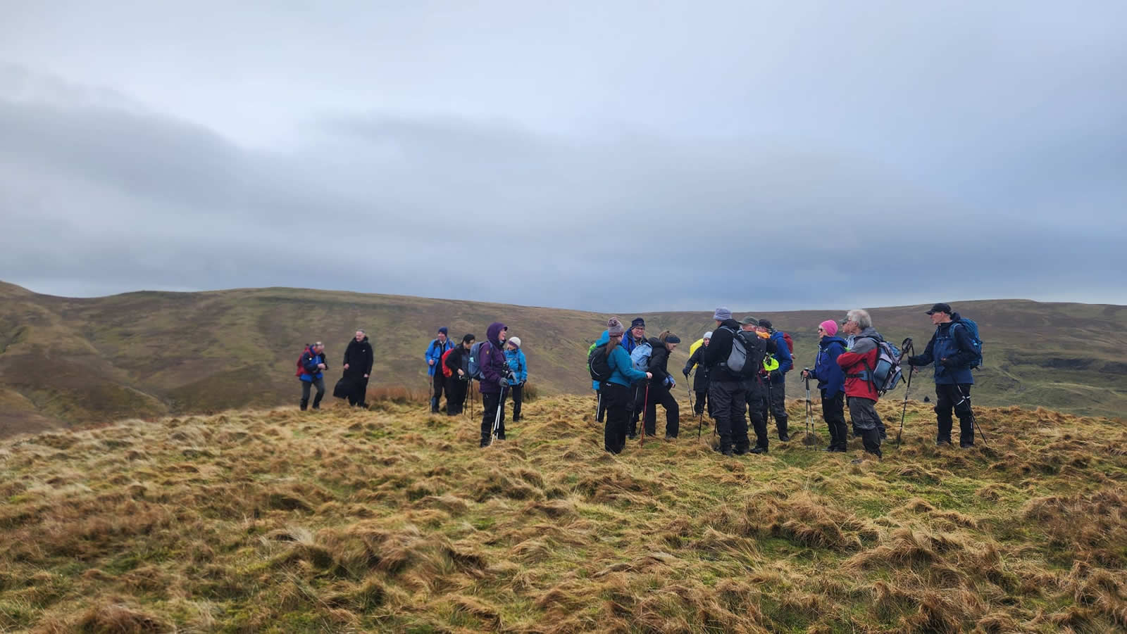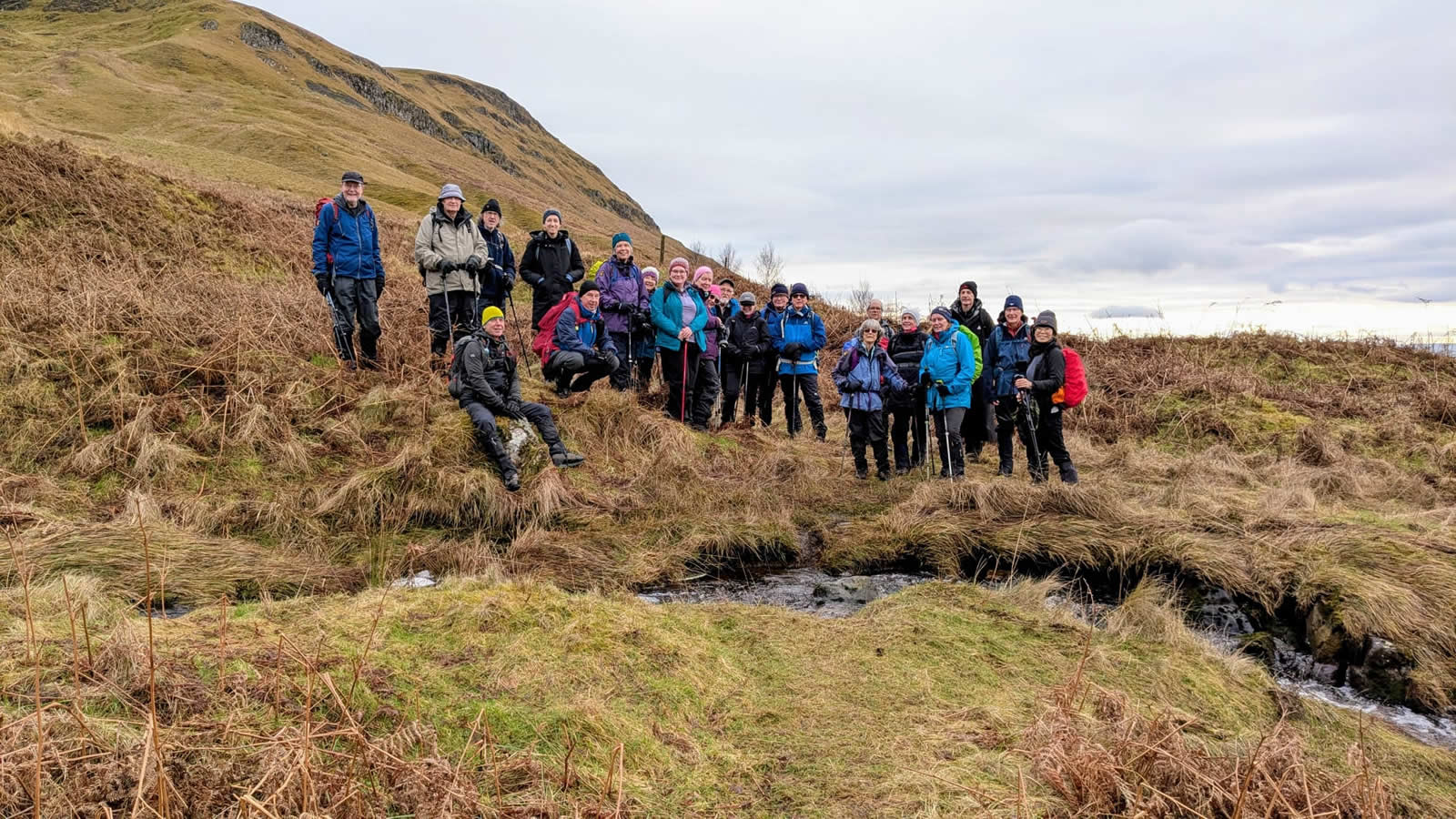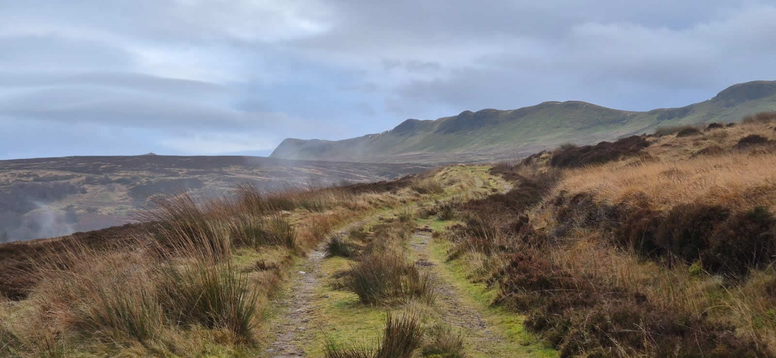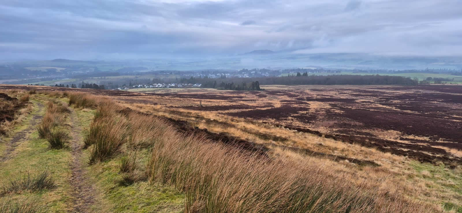 Leaving Killearn and walking through Kirkhouse Wood we ignored the right turn onto the main pipeline track and continued through the woodland alongside the boundary wall to the eastern edge of the woods to exit the woods onto the open moorland where the winter heather looked dark, almost black as it blanketed this stretch of moorland over which the narrowest of tracks, no more than a sheep-track, crossed the moorland to join up with the broader hillside path a kilometre or so away. We had left Killearn in a slight drizzle, but as we joined the hillside track and paused for a moment, confidence was growing in better weather ahead as was evidenced by the number of people discarding waterproof layers in anticipation of drier weather ahead.