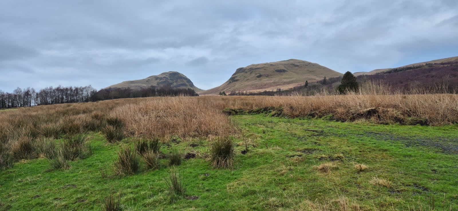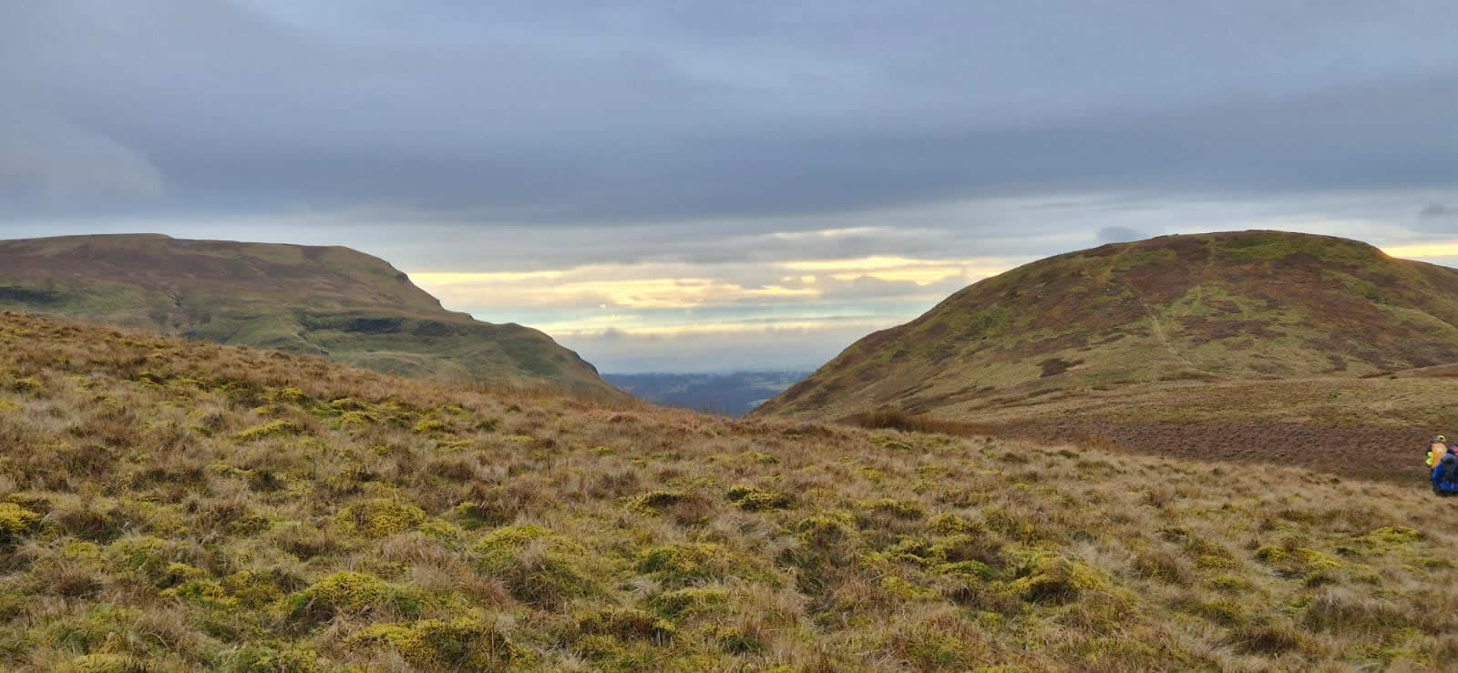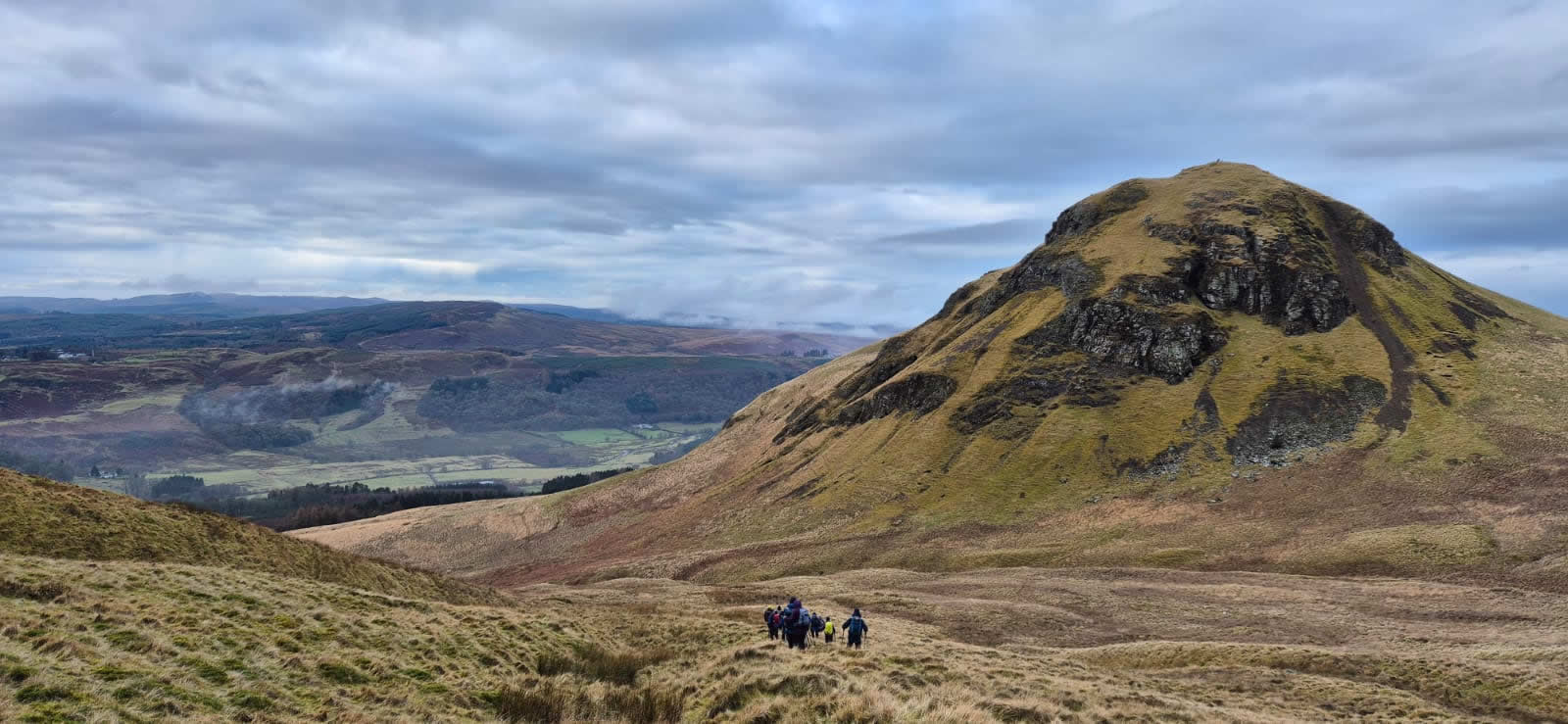 Although not the highest point in the Campsie Fells, Dumgoyne is probably the most recognisable and visited top, its conical form in complete contrast to the generally flat, grassy hills that make up the Campsie Fells. However, this most recognisable and prominent feature was not our target for today, we were headed a mere 600 metres east south east of Dumgoyne to it’s little sister, Dumfoyn, at 426m high and a mere 1 metre lower than Dumgoyne this is a much less frequented hilltop which offers an outlook and different aspect of Dumgoyne that goes unseen from the regular approach paths to Dumgoyne.