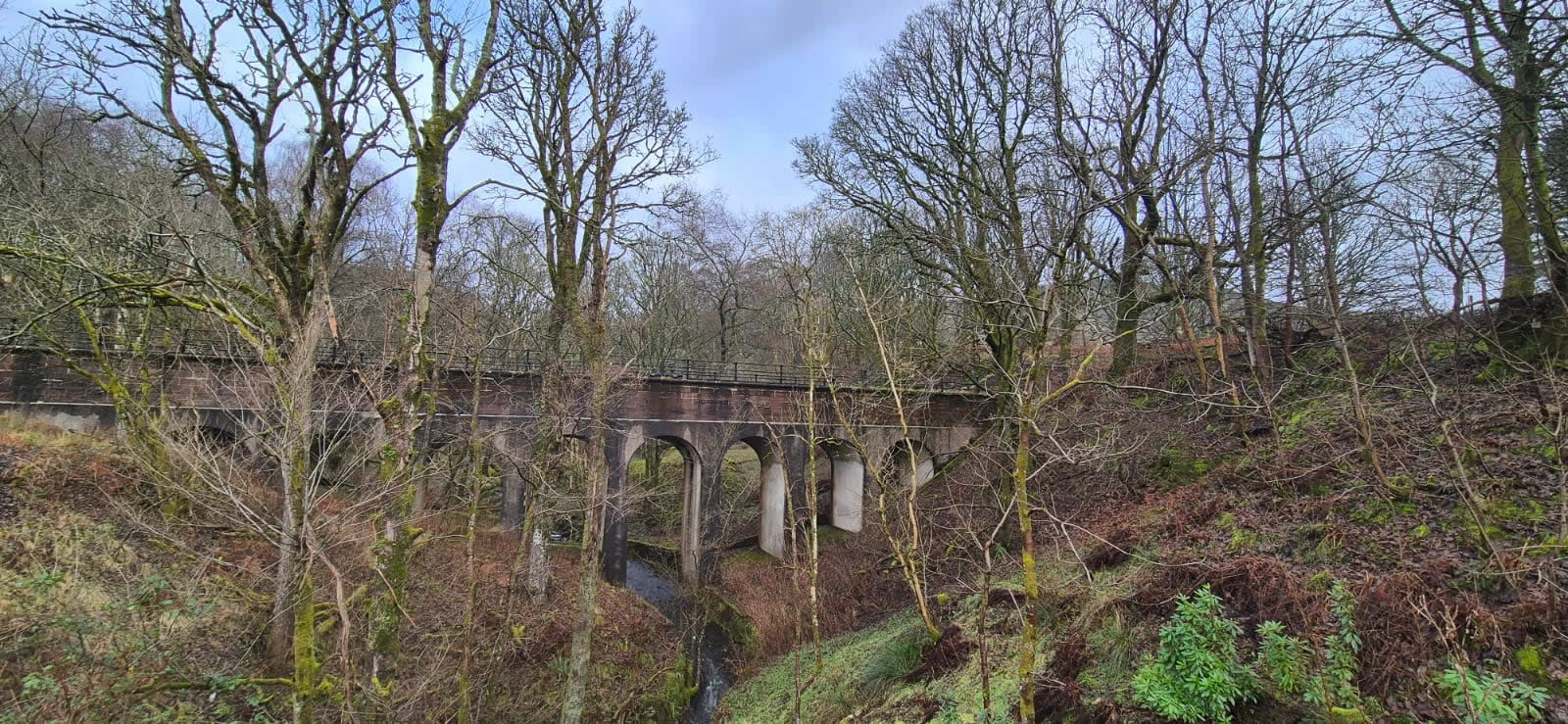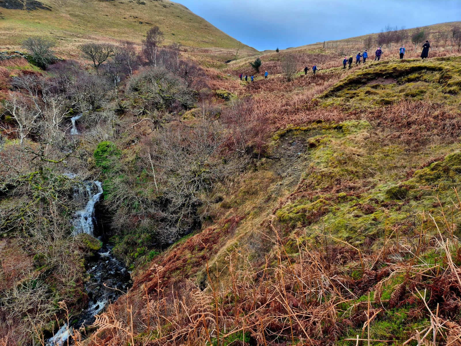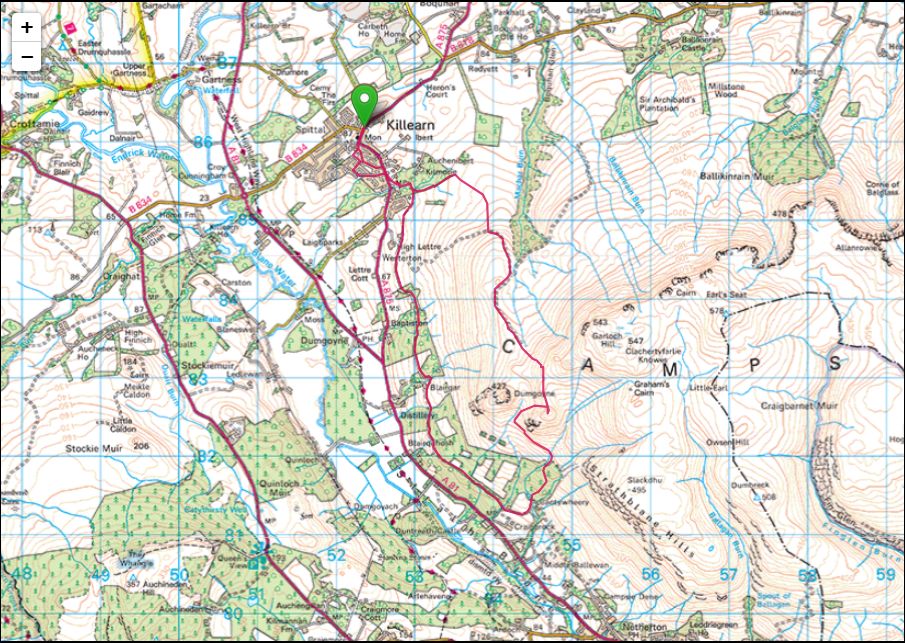 Refreshed and fit for the off, we descended the grassy, pathless hillside between Dumgoyne and Dumfoyn contouring southeast below Dumfoyn to pick up yet another narrow track leading to the un-named burn in Cauldhame Glen, across which we linked up with the track down the east side of the burn, passing an impressive waterfall enroute as we made our way downhill on what was probable the most awkward section of the whole route. Awkward in that the ground underfoot was short, wet grass on a bed of mud which required a little concentration to avoid any sudden mishaps which would leave one scrabbling around in a muddy bath. We emerged from the glen onto the “pipeline” track above Craigbrock for what was then a simple leg stretch back along the course of the pipeline to Killearn.