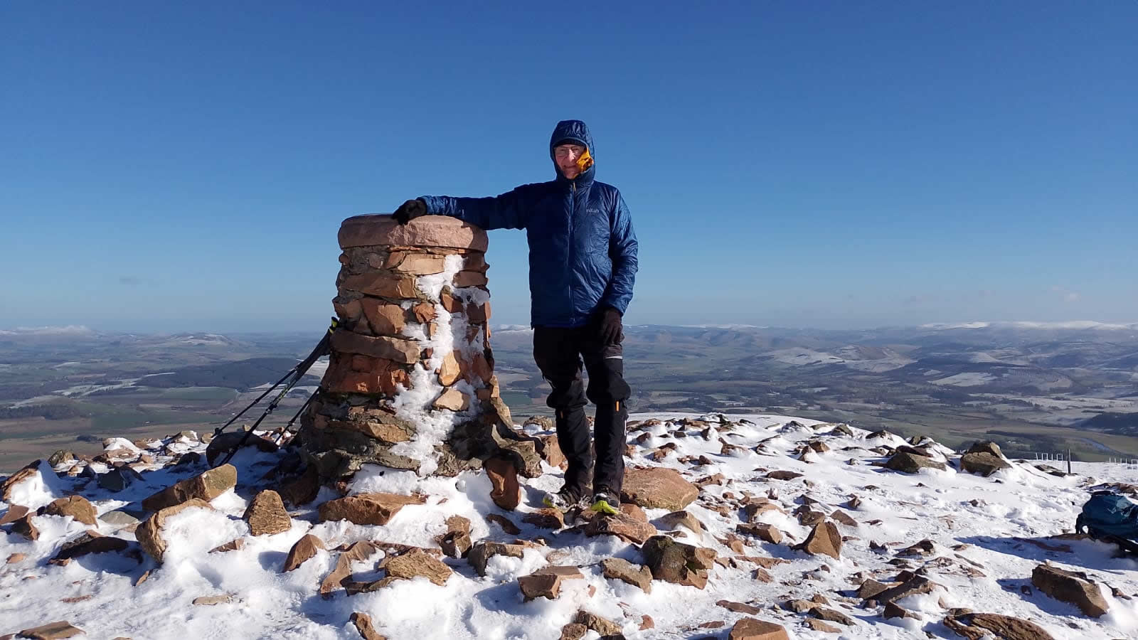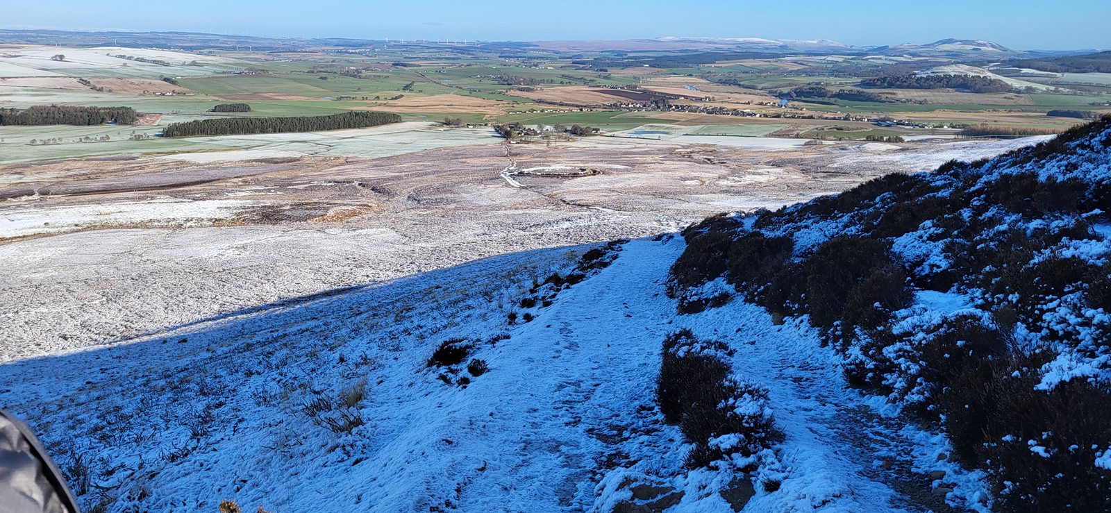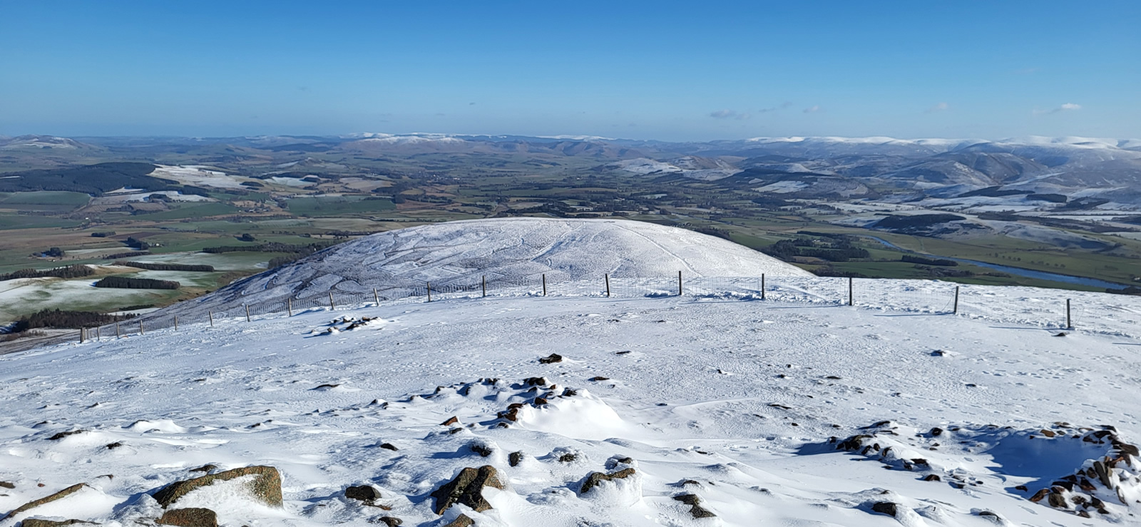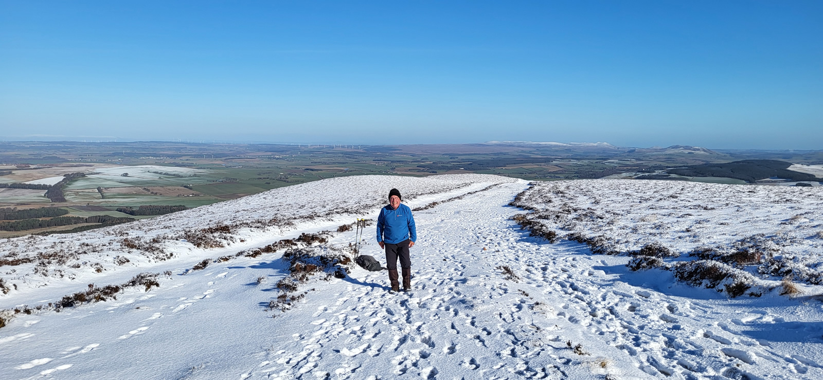 The north shoulder route has a climb of just over 500m, yet the gradient of the path ahead never looked more than a fairly shallow ascent, and so height is gained at a very steady pace, great for a day such as today when the air is crisp, snow underfoot and visibility in excess of 50kms, a day of leisurely walking to be enjoyed for all that is on offer. As stated earlier, Tinto is a popular hill, and so it was today, with the usual variety of walkers and their varied modes of dress; and this is where being prepared pays dividends. The climb up was sheltered, calm and sunny, yet on reaching the summit there was a sudden changing of the temperatures as a fairly cold wind suddenly hit you. Others, slightly ahead of us, turned and scampered off the top enroute back downhill passing us and warning of the cold winds. But we were prepared, no problem, and why would you rush away, the views were stunning and it was simply a matter of digging out that extra layer of warm clothing from our rucksacks and finding a nice spot to sit and enjoy the break and hills around us, warm and cosy in our extra layers, simple!
