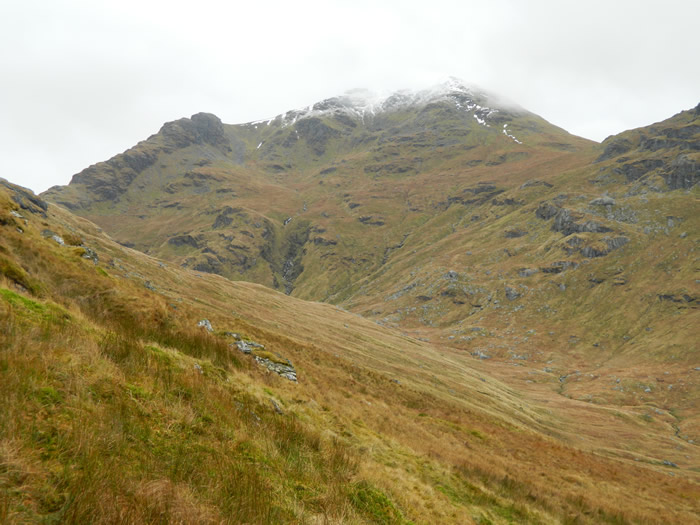 The estate track leading into Glen Kinglas is a good hard surfaced track which makes for easy walking along this beautiful glen through which Kinglas Water flows, flanked on both sides by steep hillsides with a mixture of grassy and craggy slopes. We followed the track until it meets with the Allt Chnoic just short of the shores of Loch Sloy, at which point we struck off over the pathless hillside ascending towards distant ridge line and the minor top of Beinn Dubh at 773m.
