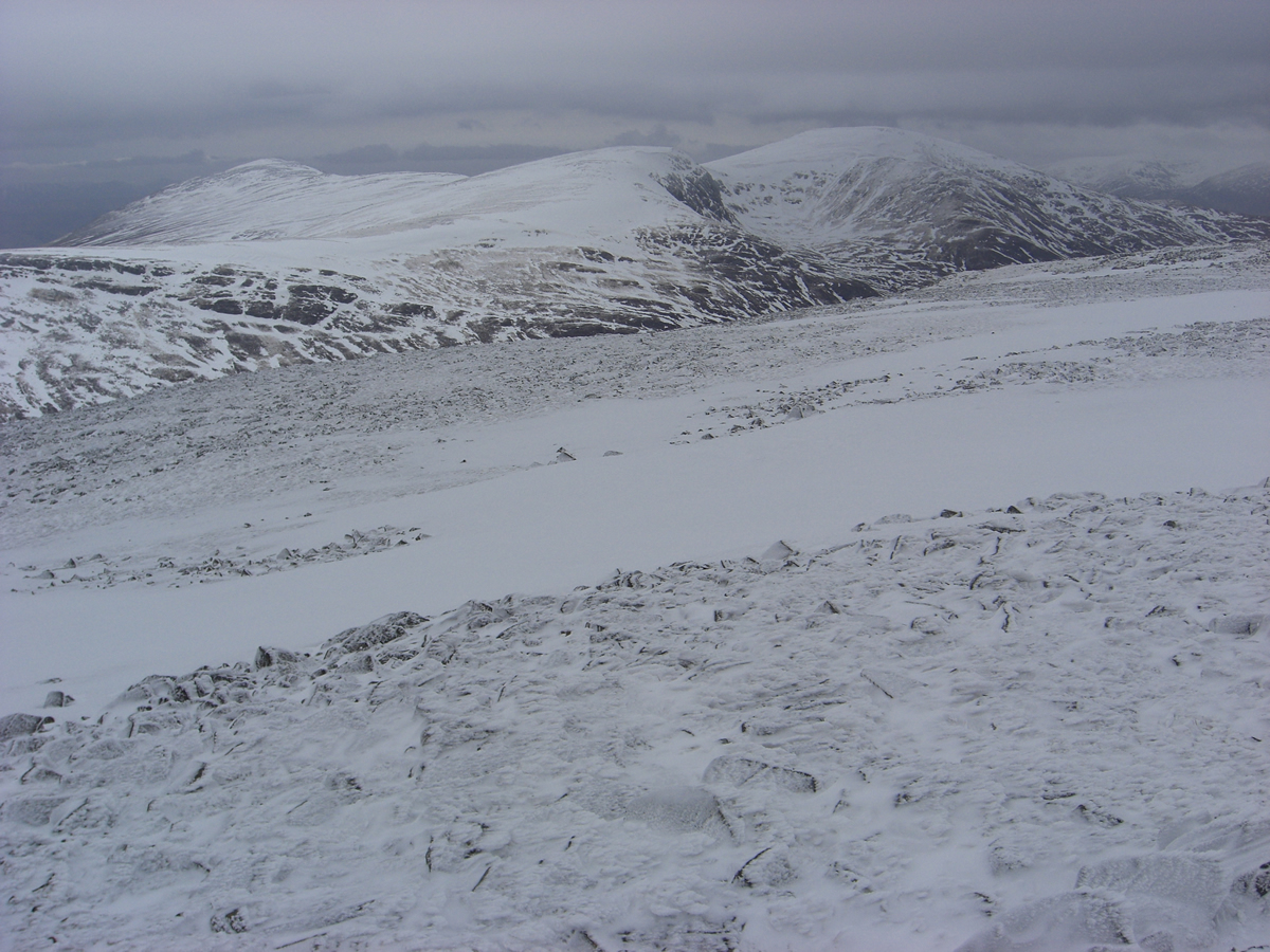 As we started up the ridge, the wind gained in strength, but thankfully never really reached the levels forecast, although it did remain extremely cold throughout the day. The lower slopes of Beinn na Lap are easy grassy slopes which gradually give way to heather and eventually, once on the crown of the broad whale-back ridge, rock. We reached the snow line at around 650m height, nothing of significance, although the mixture of ice and snow on the rocks did make the going rather slippery in places.