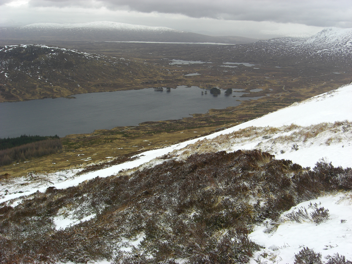 The exposed summit was bitterly cold, and we stayed there just long enough for a few pictures and to decide which route we would take to make our return to Corrour. The usual way is simply to reverse the outward route, but as you will know, if you are a reader of my reports, that's not how we like to do things. And so we decided to drop directly off the summit ridge, heading generally south and aiming for the tree line of the forested area which runs along the northern shoreline of Loch Ossian, and thence through the forest to rejoin the estate track on the loch side.