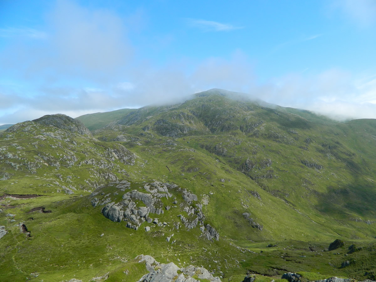The weather was being kind to us, as the low mist remained throughout the ascent of Beinn Each, keeping us cool, and almost on cue, began to break up and burn off just as we reached the summit, opening up the view south over Ben Ledi, and north along our intended route. Although, at this point, Stuc a'Chroin remained behind a covering of the last remnants of the mist.