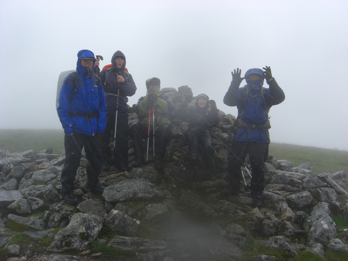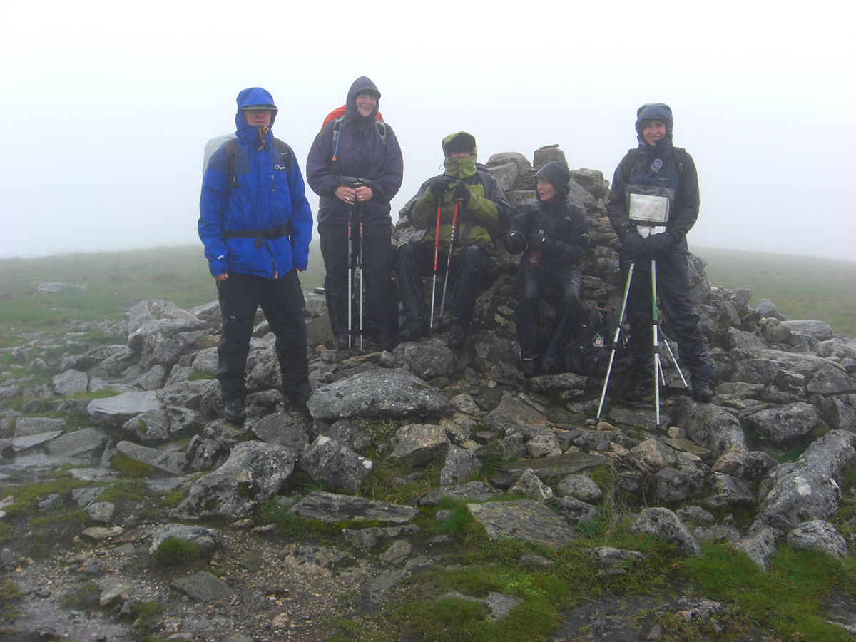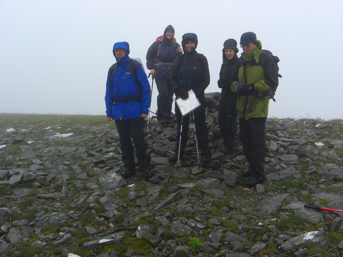 From the bealach, it was a short ascent north east over gentle slopes to our first summit, Stob Poite Coire Ardair, 1054m. And right on cue, with perfect timing, Kate, whom we had last seen heading off towards Carn Liath, re-appeared just as we were making our way to the summit, from where she joined us for the remainder the day. It was not a day for taking lunch at the summit, and so we retraced our steps down to the bealach and found a small hollow in which to huddle out of the wind, but alas, not the rain, to take our lunch break.