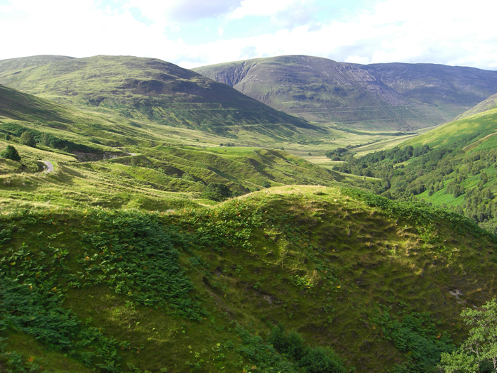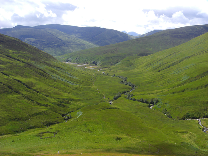 The estate road winds past the lodge and crosses the River Turret via the 18th century Turret Bridge at which point a good track leads up and over the moraine humps beyond the bridge and continues up the glen towards a number of large sheep fanks, and then disappears into a maze of high grasses. Our planned route was then to continue beyond the sheep fanks and go further up Glen Turret to its junction with Gleann Eachach and cross the river by a bridge, unmarked on the maps, but which the SMC Corbett Guide mentions as a crossing point.