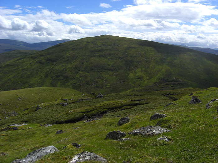 One Carn Dearg completed, and onto the next. A short steep descent south east followed by a short ascent took us over the 702m top of Meallan Odhar and down once again to negotiate the peat hags in the 572m bealach before we made the final climb up the grassy north west slopes to Carn Dearg - South. A rocky knoll and cairn mark the summit, which although not as high as Carn Dearg - North, actually gives a greater feeling of the remoteness of the glens that fan out from its base.