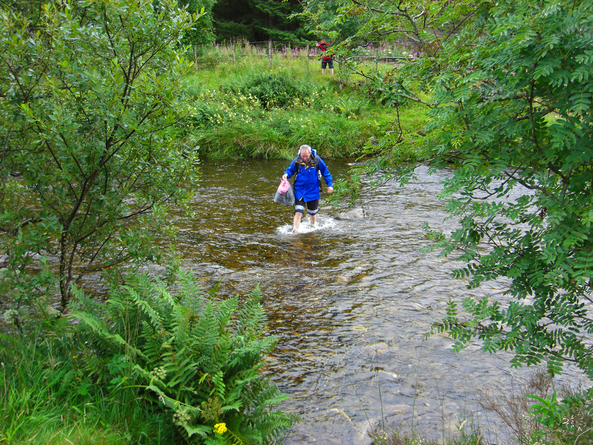 To the casual onlooker, we must have looked rather weird on leaving the car park with rucksacks and full walking gear - except for our footwear, which was a mixture of wet-suit boots, sandals and some very posh Fred Perry tennis shoes, oh and our trousers rolled up above the knees as we made our way down to the edge of the River Lochy, which thankfully was not quite as deep as a few days previous when it was well above my knees; Lindsay did sigh with relief that she would not require the use of her snorkel for the crossing.